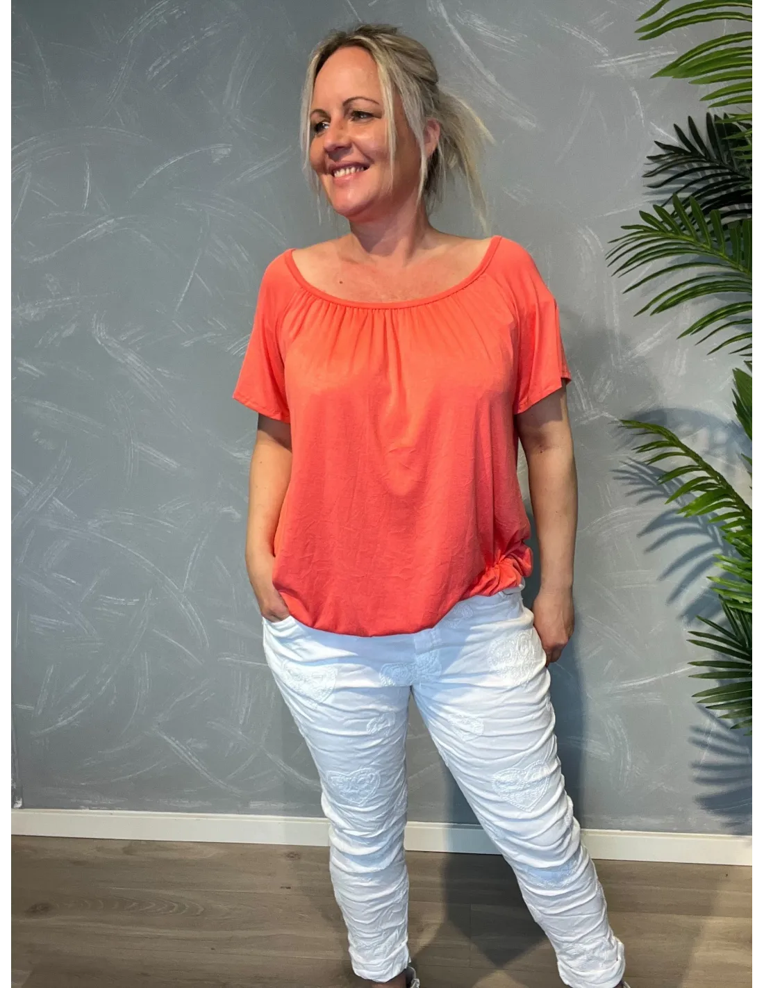 Elastik i halsen gør den mulig at bære off shoulder.