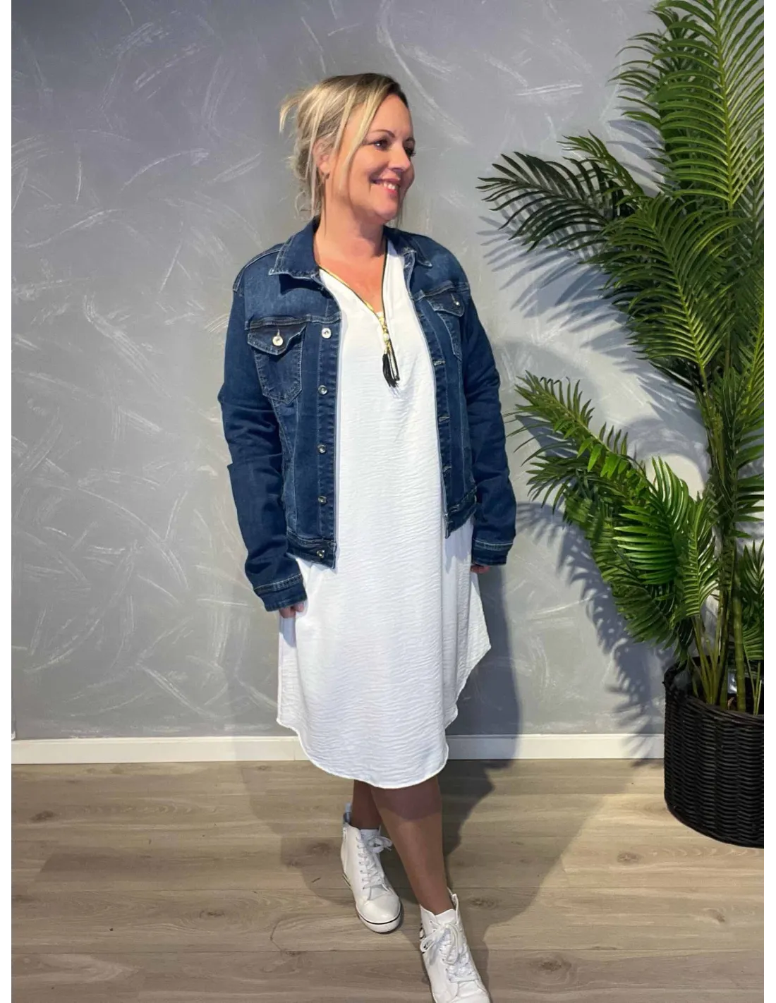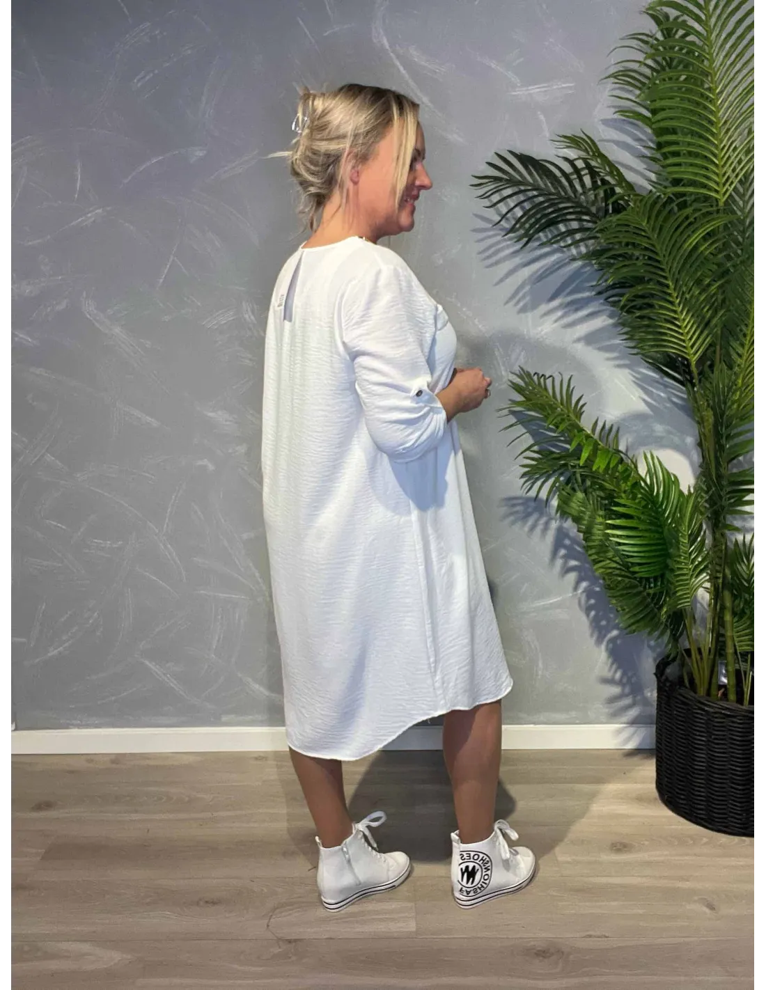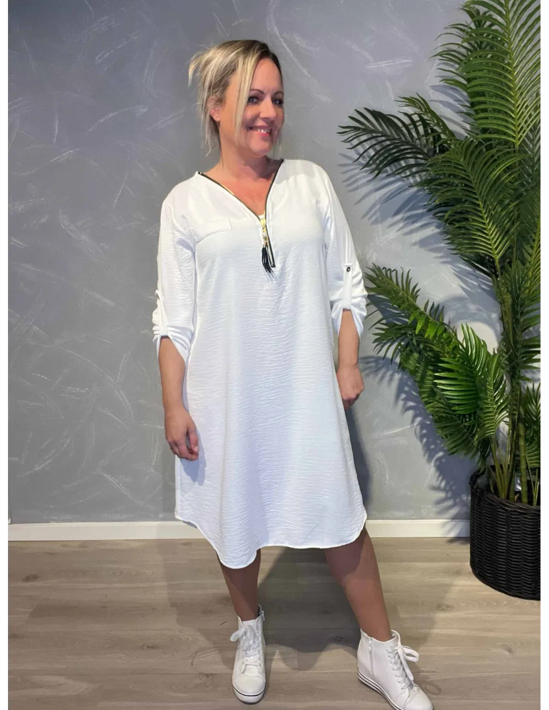 Denne elegante chiffon kjole fra vores TIPPY kollektion kombinerer klassisk hvid farve med glamourøse gulddetaljer De smukke knapper ved ærmerne og den lette chiffon kvalitet skaber et feminint og stilfuldt look, perfekt til enhver lejlighed Modellen er 163 cm høj og bruger M-L Her har hun kjolen på i S-M