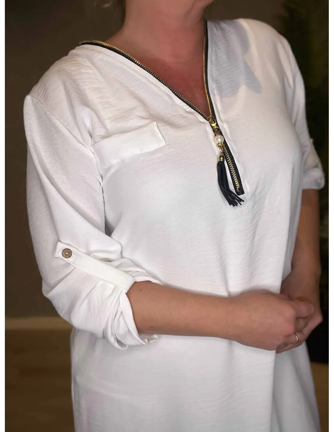 OM PRODUKTET: ✓ 95% viskose, 5% elastan ✓ Hvid farve ✓ Gulddetaljer ved ærmer ✓ Knapper ved ærmerne ✓ Størrelser S/M, L/XL ✓ Let chiffon kvalitet ✓ Afslappet pasform ✓ TIPPY kollektion