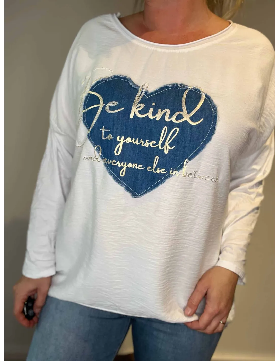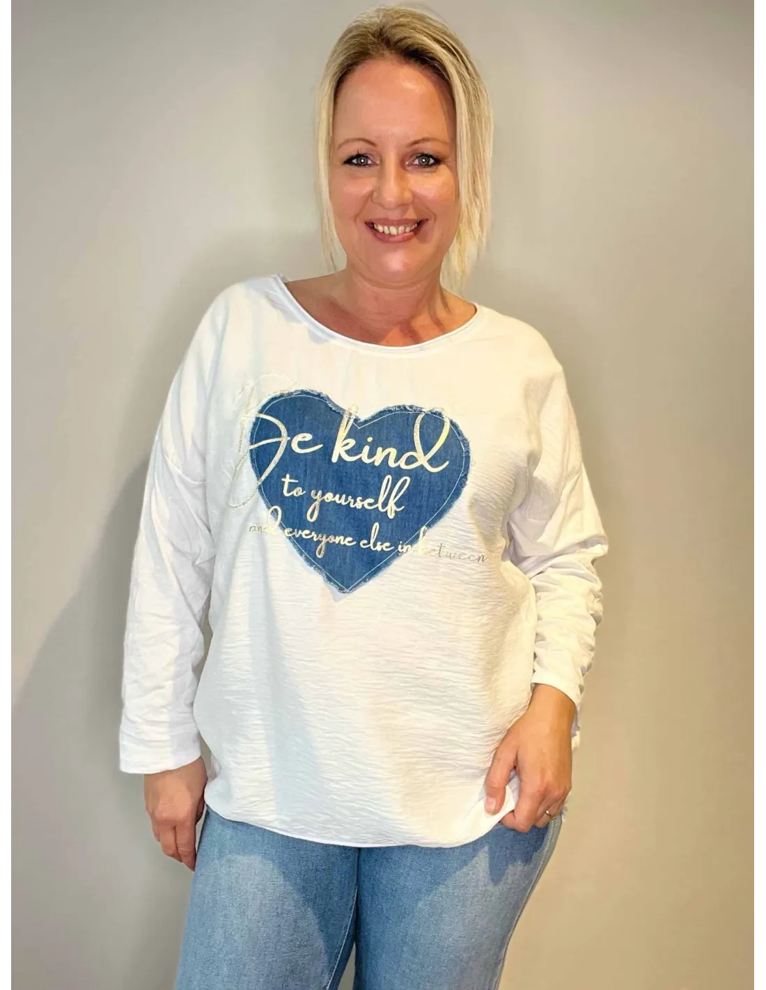 Hvid langærmet bluse med denim hjerte og "Be Kind" sølvprint, casual pasform, perfekt til den modne kvinde