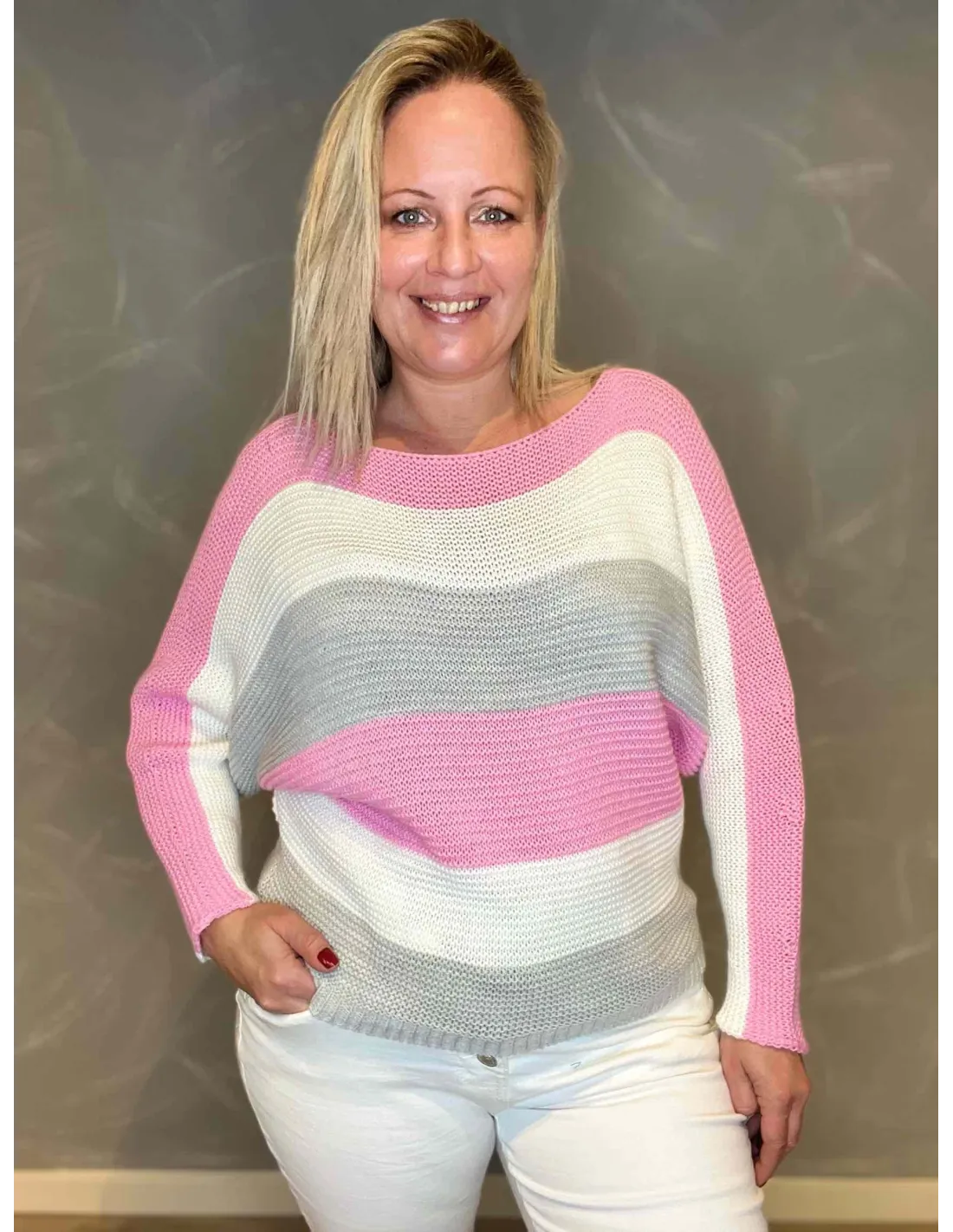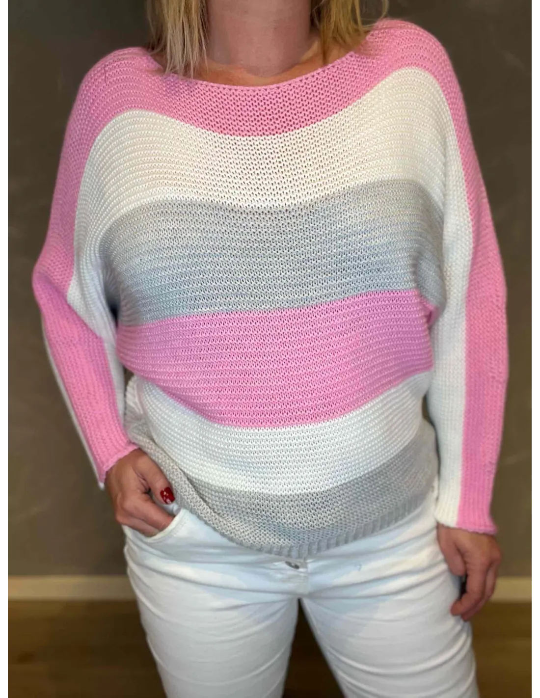 Denne iøjnefaldende striktrøje er skabt til den modebevidste kvinde, der elsker at sætte farve på hverdagen. De pink striber spiller elegant sammen med hvide og grå nuancer, hvilket skaber en perfekt balance mellem det dristige og det sofistikerede. Den særlige strikketeknik giver et let og luftigt udtryk, der er ideelt til den moderne kvinde