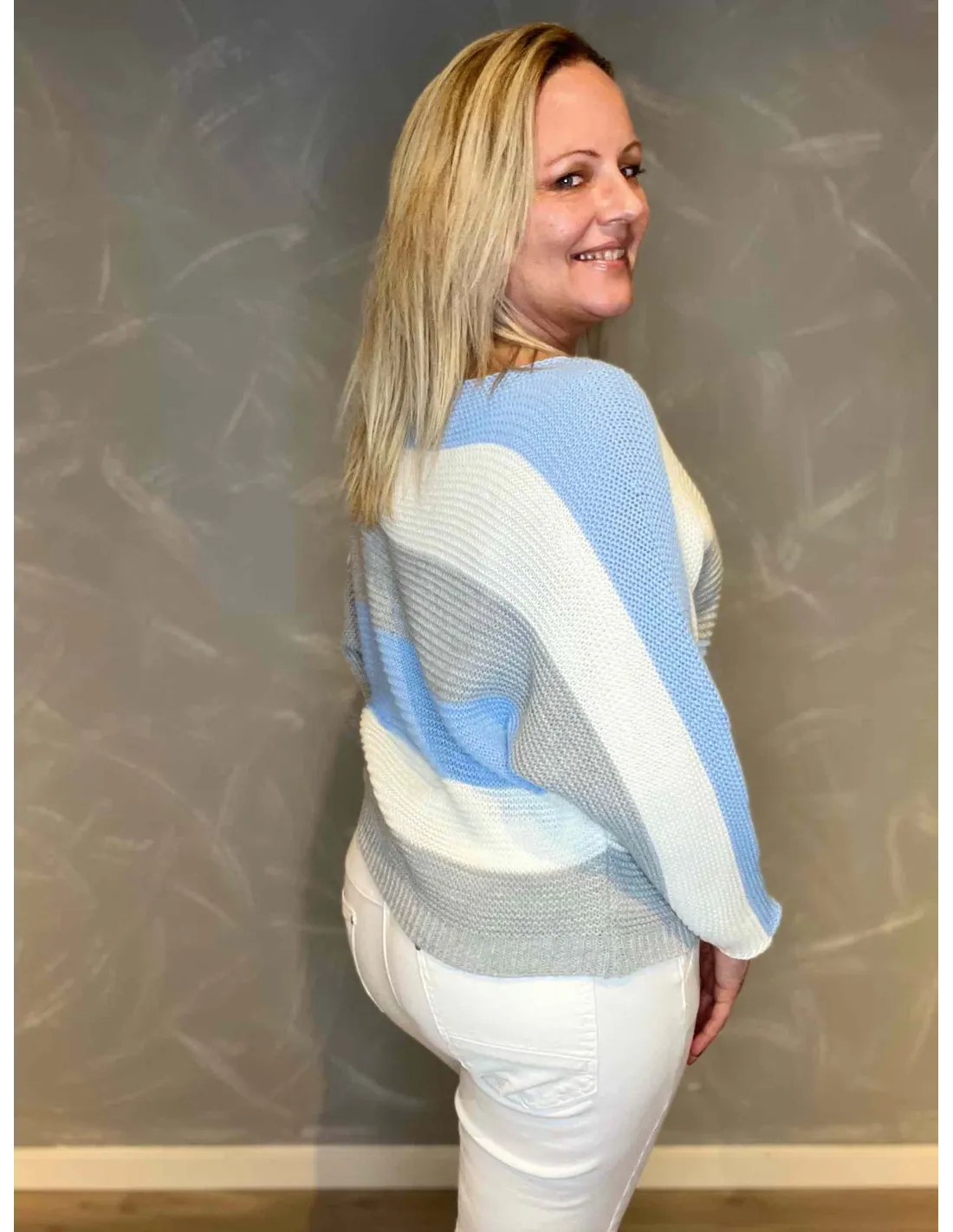 Sofistikeret striktrøje hvor himmelske sky-nuancer møder hvide og grå striber i et harmonisk samspil Fremstillet i en let og behagelig blanding af 85% akryl og 15% nylon, der sikrer både komfort og holdbarhed En alsidig striktrøje der bringer et strejf af nordisk himmel til din garderobe