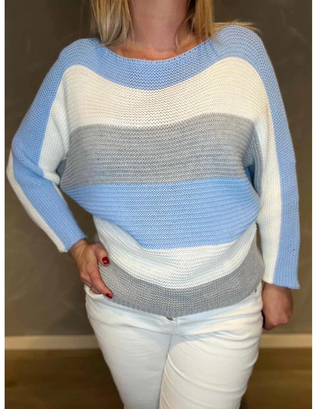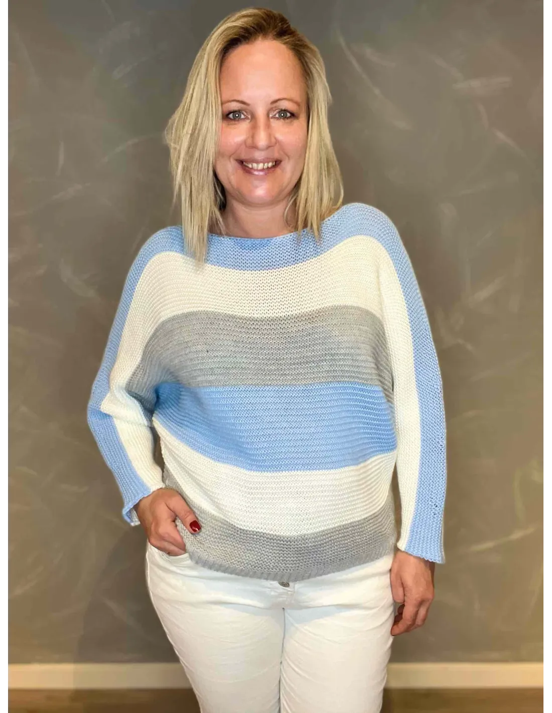 OM STRIKKEN: ✓ Premium kvalitet: 85% akryl, 15% nylon ✓ One size model med brystmål 124 cm ✓ Stribet design i sky, hvid og grå ✓ Let og luftig strikket struktur ✓ Perfekt til både kølige sommeraftener og overgangsperioder