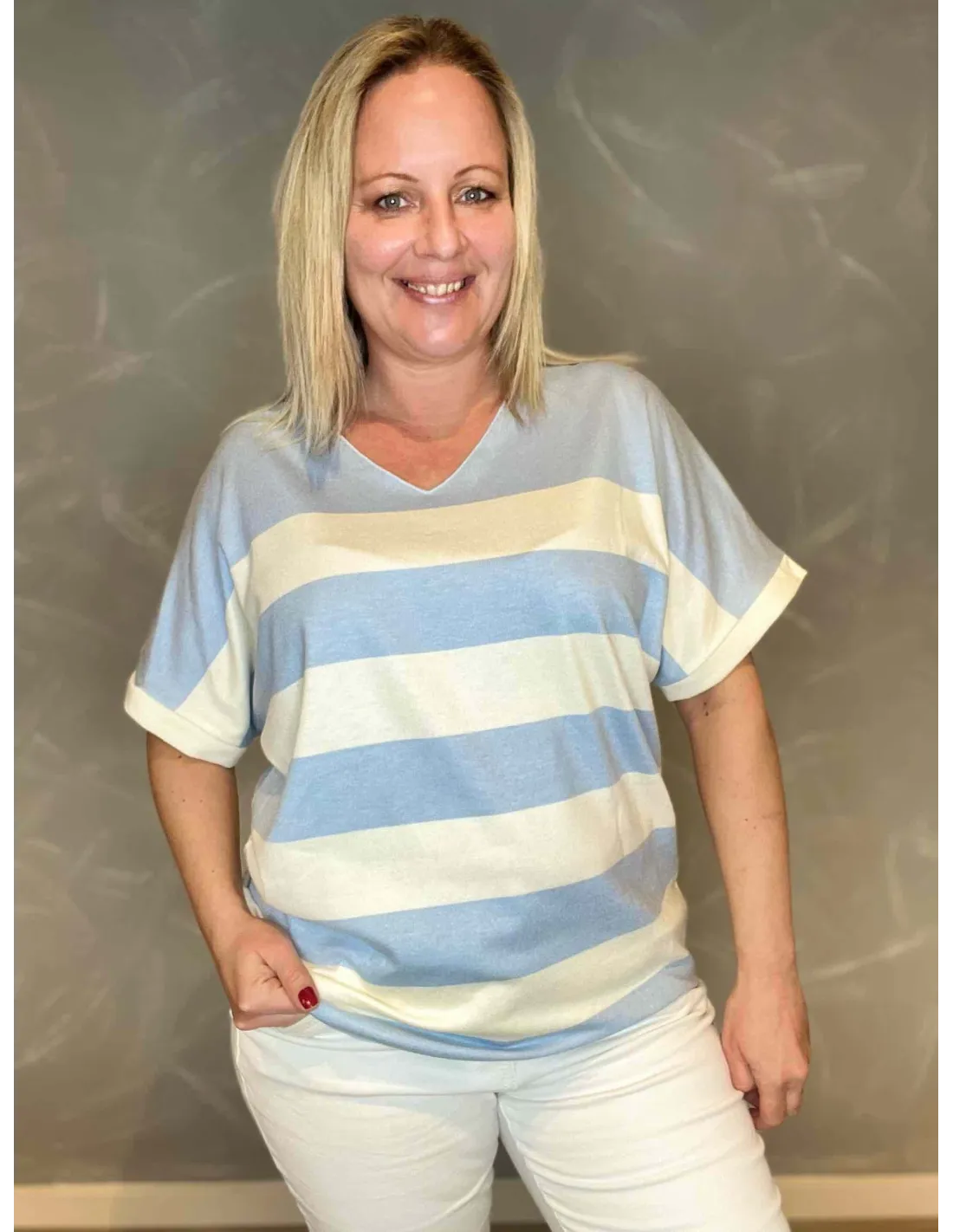 Luksuriøs finstrik med striber i sky blå og hvid Fremstillet i blød og behagelig kvalitet af 40% viskose, 30% lana, 30% angora Find din perfekte størrelse i vores størrelsesguide.