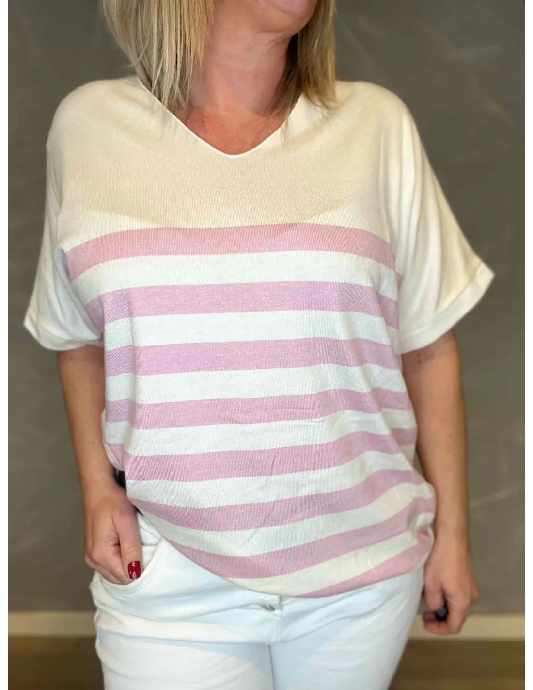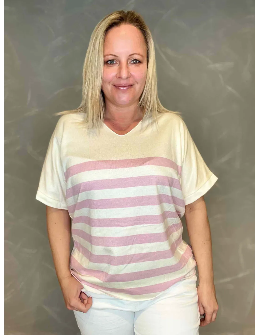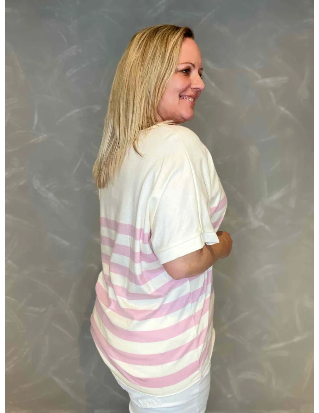 Luksuriøs finstrik med brede striber i rosa og hvid Fremstillet i blød og behagelig kvalitet af 40% viskose, 30% lana, 30% angora Find din perfekte størrelse i vores størrelsesguide.