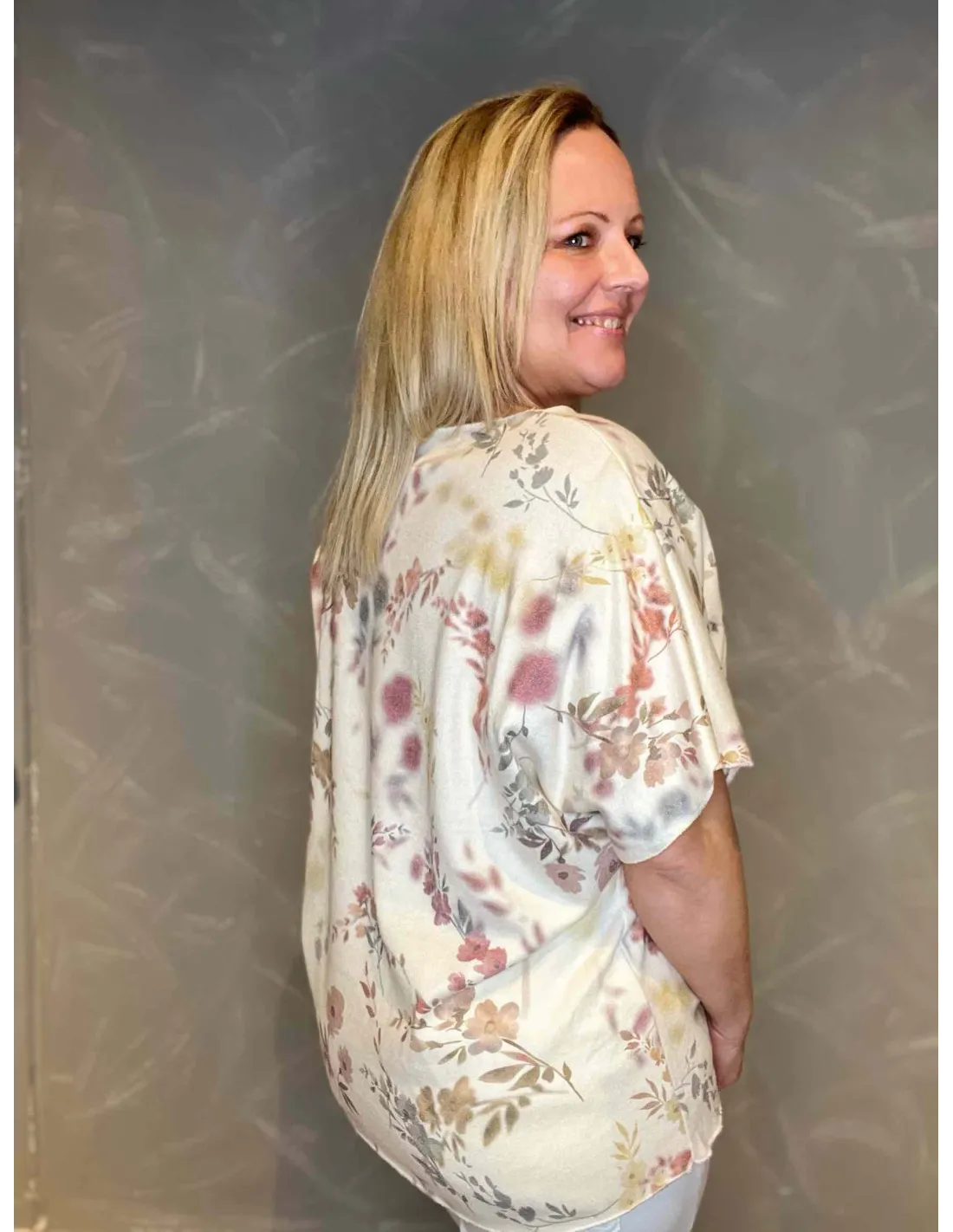 Luksuriøs finstrik med blomsterprint i off white med blå detaljer Fremstillet i blød og behagelig kvalitet af 40% viskose, 30% lana, 30% angora Find din perfekte størrelse i vores størrelsesguide.