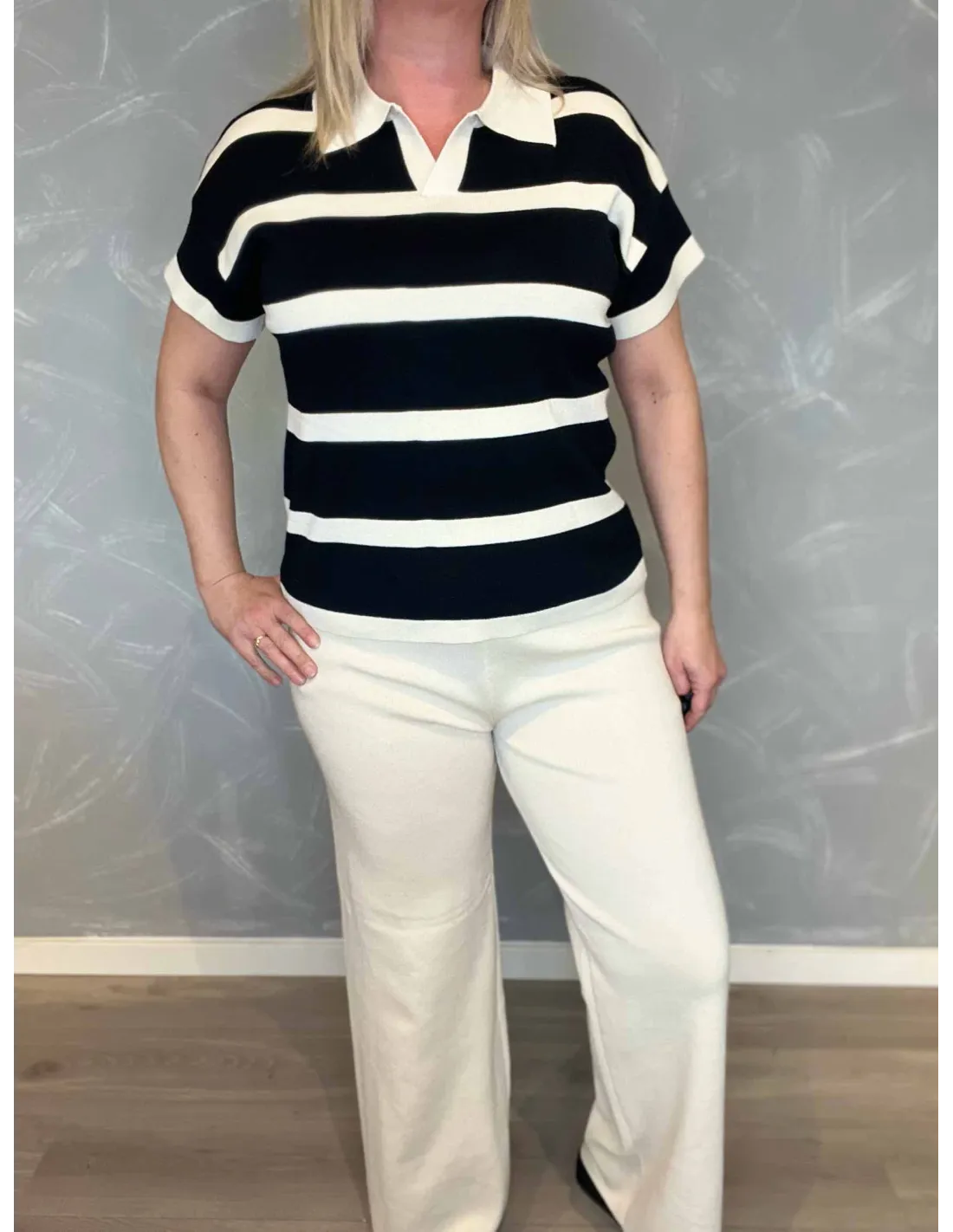 • Detaljer: Stribet overdel, vide bukser