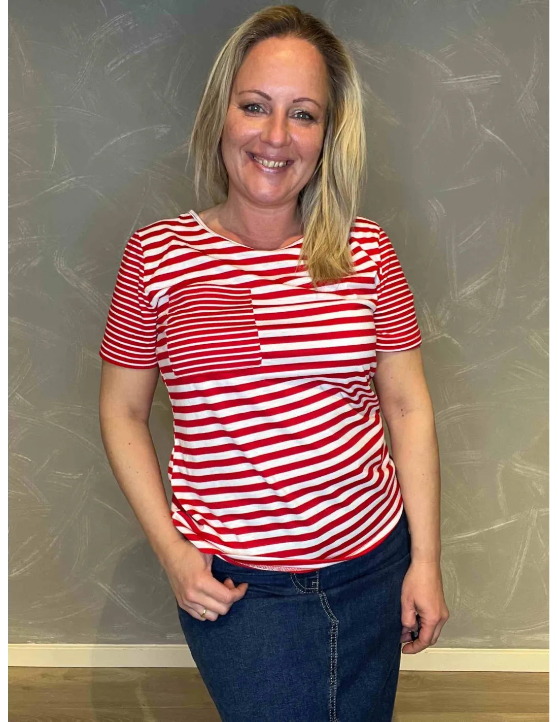 "TIPPY Design stribet t-shirt i rød og hvid, casual pasform med brystlomme, perfekt til den moderne kvinde"