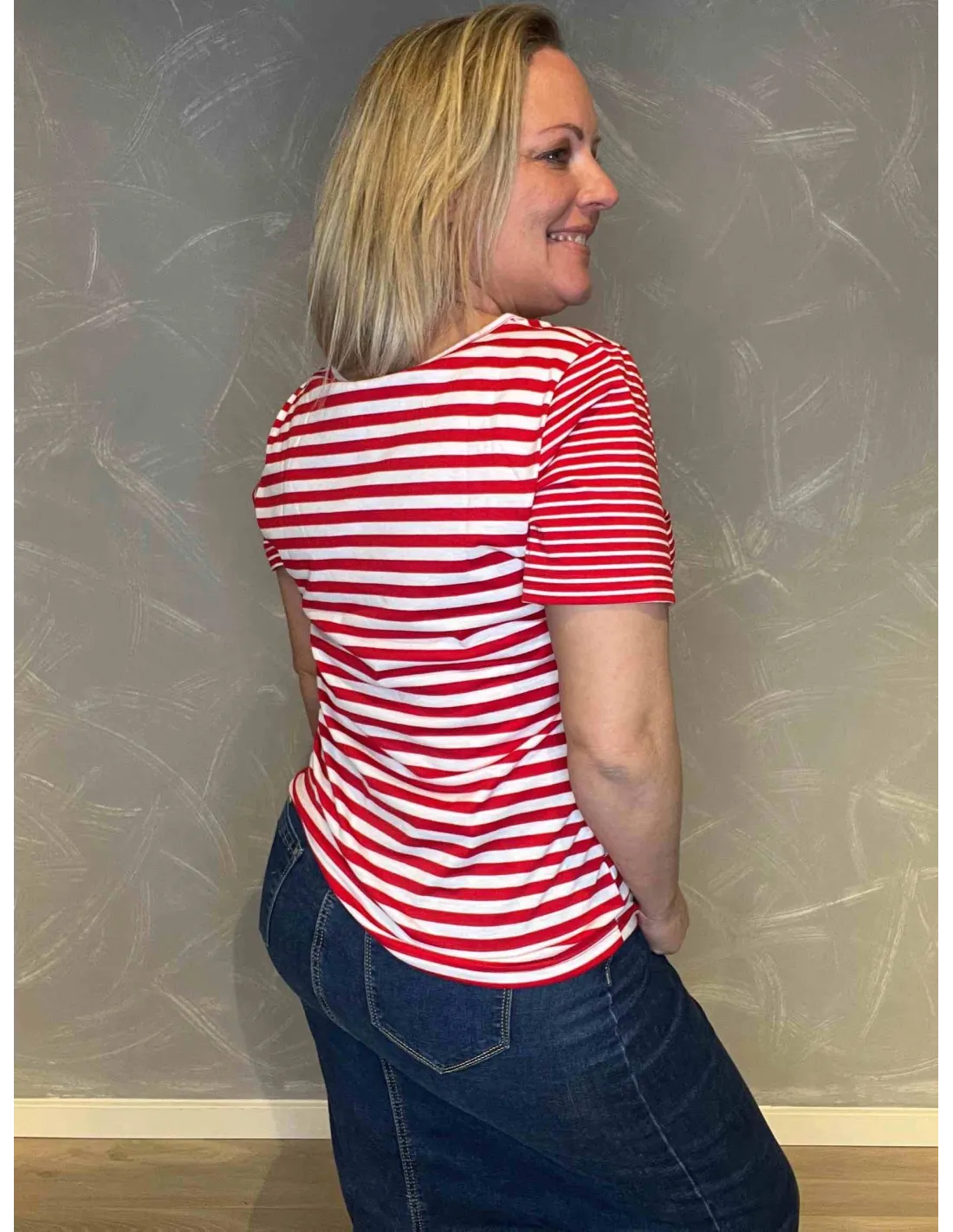 "Bagside af stribet t-shirt, viser komfortabel pasform" TIPPY