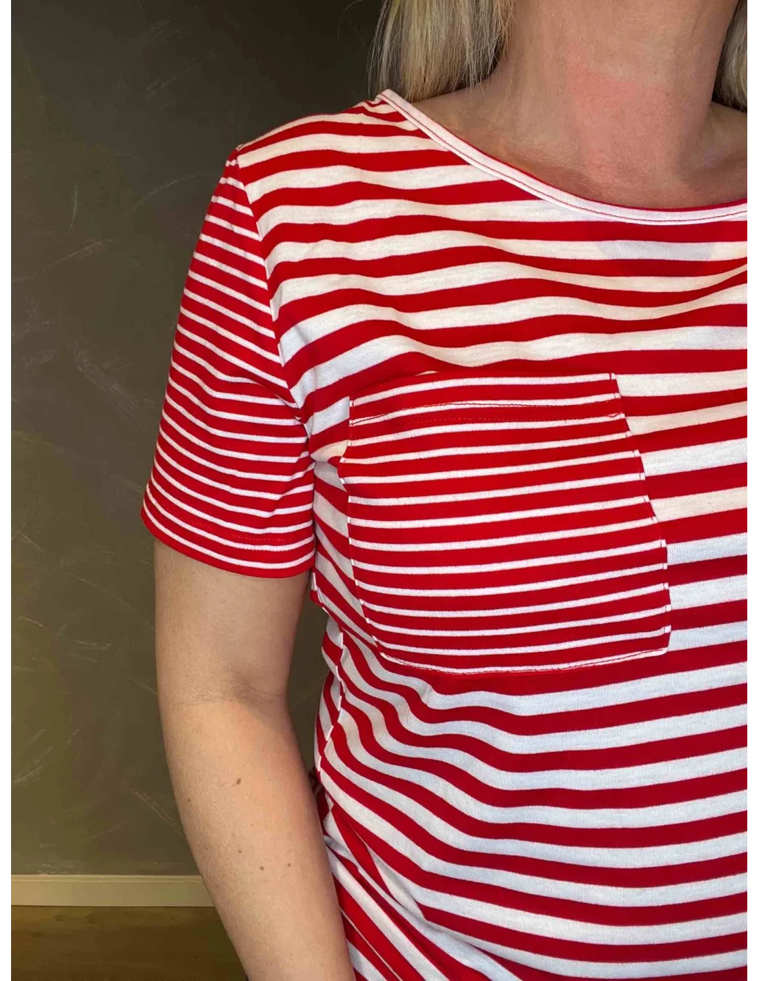 Stribet T-shirt med lomme | Rød | 25091