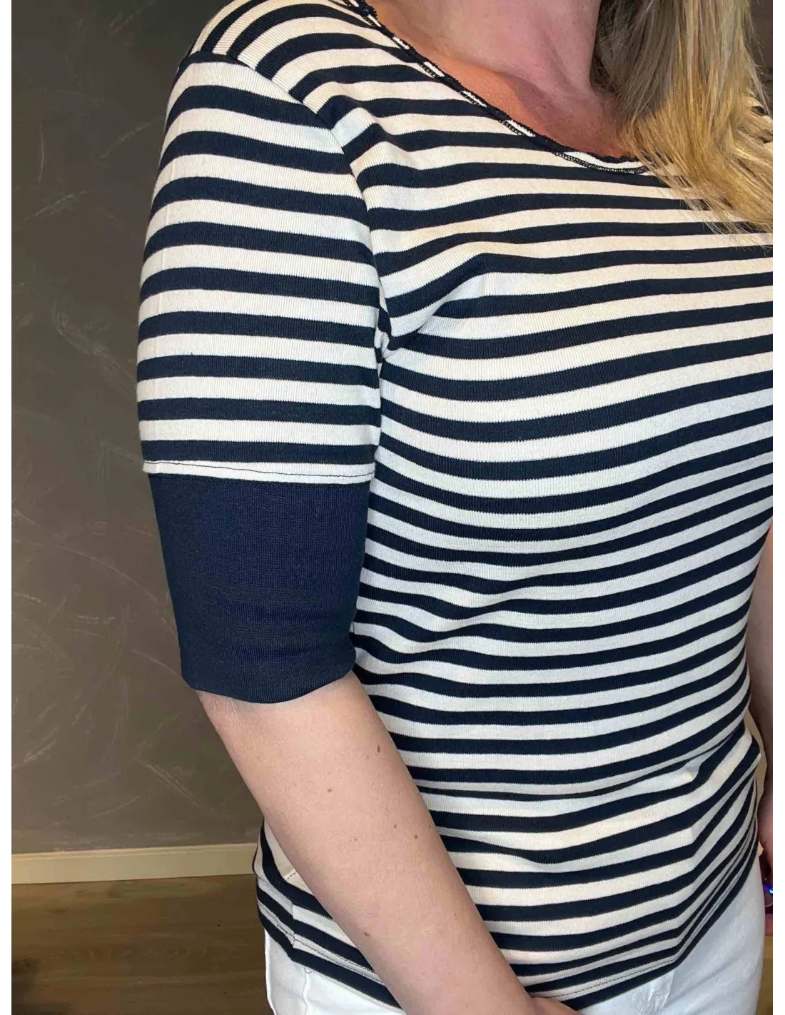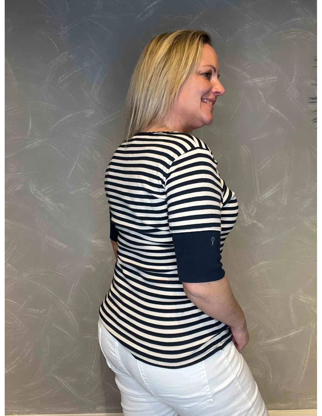 Denne navy stribede bluse til kvinder fra Design by Tippy er fremstillet i 100% bomuld, som føles blødt og behageligt mod huden.