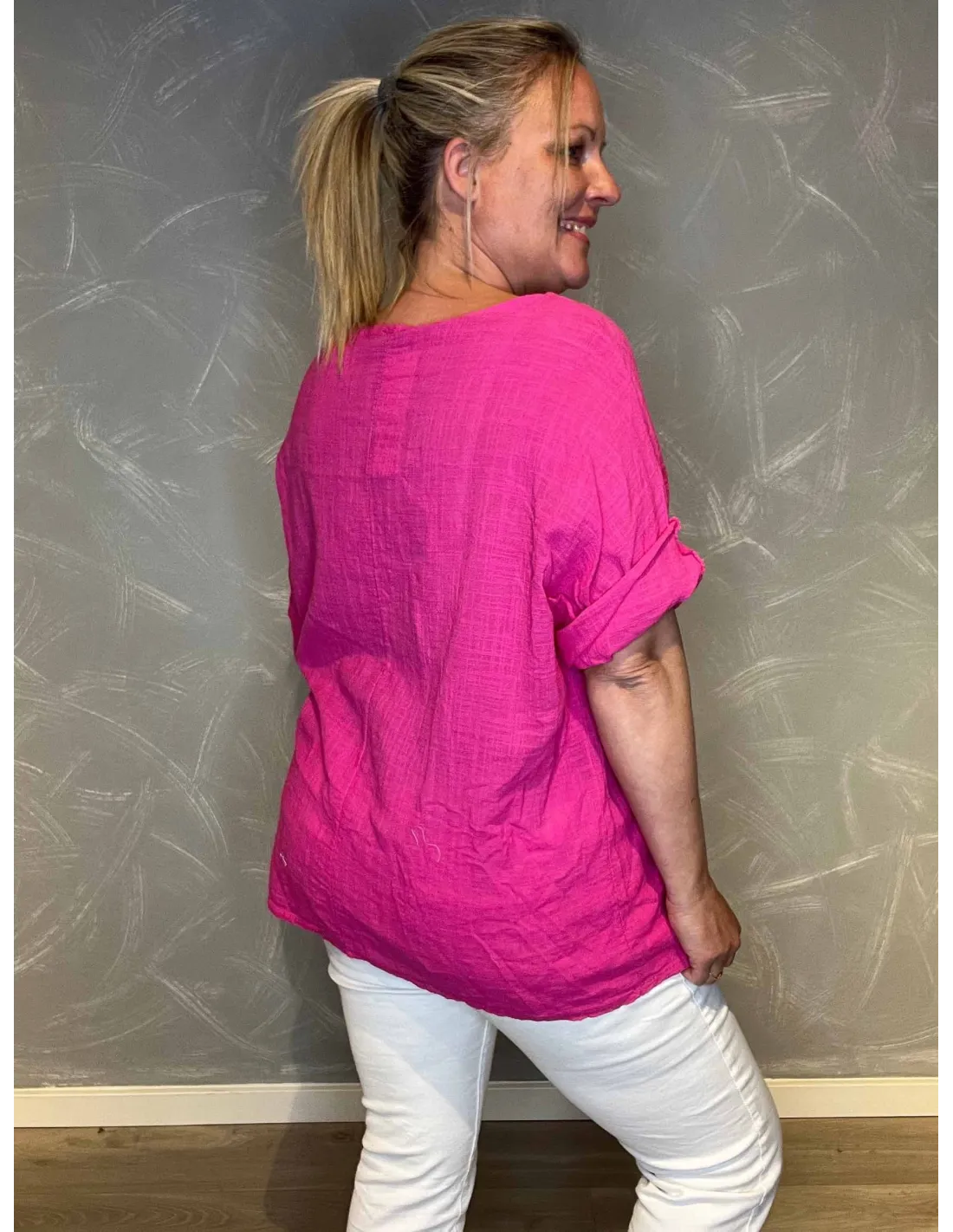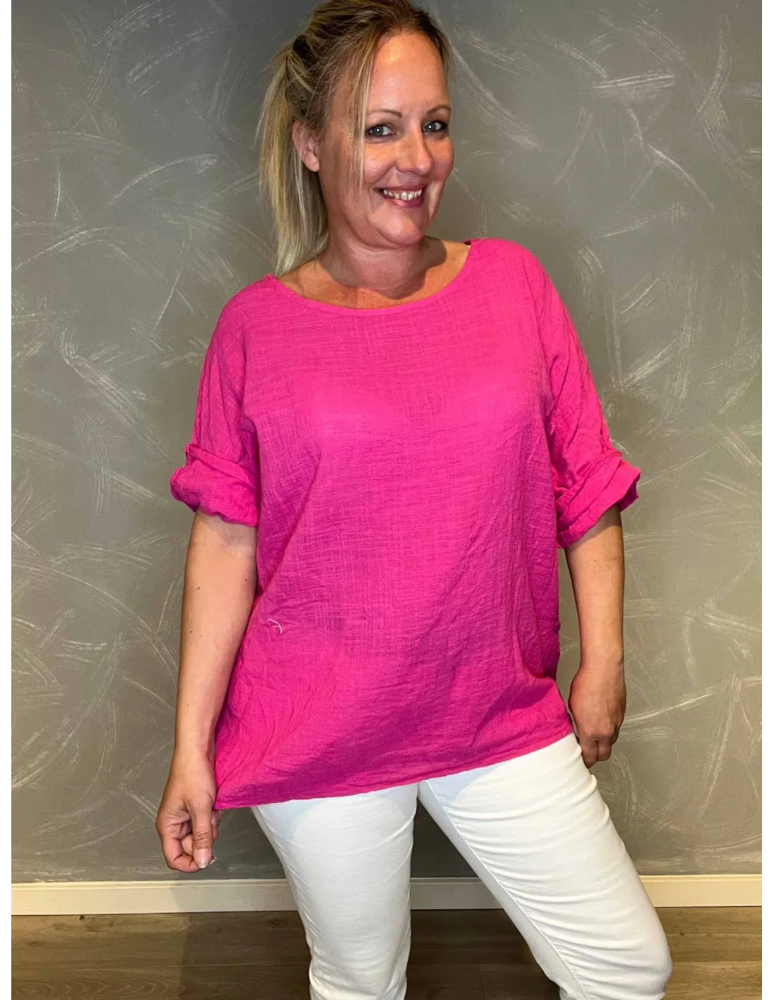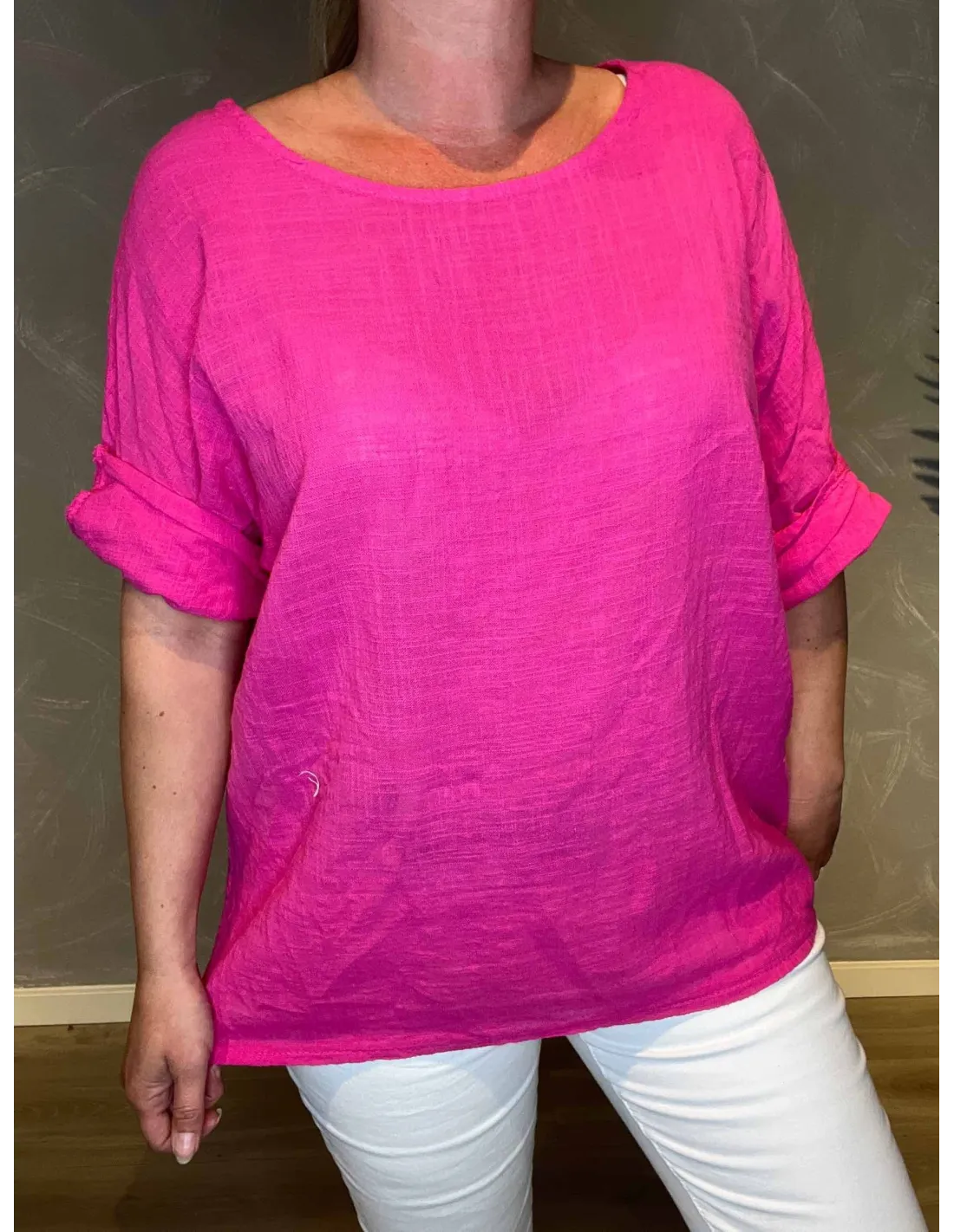 OM PRODUKTET: ✓ 100% bomuld ✓ Brystmål 140 cm ✓ Rund hals ✓ Opsmøgede ærmer ✓ Pink farve ✓ Let og luftig kvalitet ✓ Dansk design