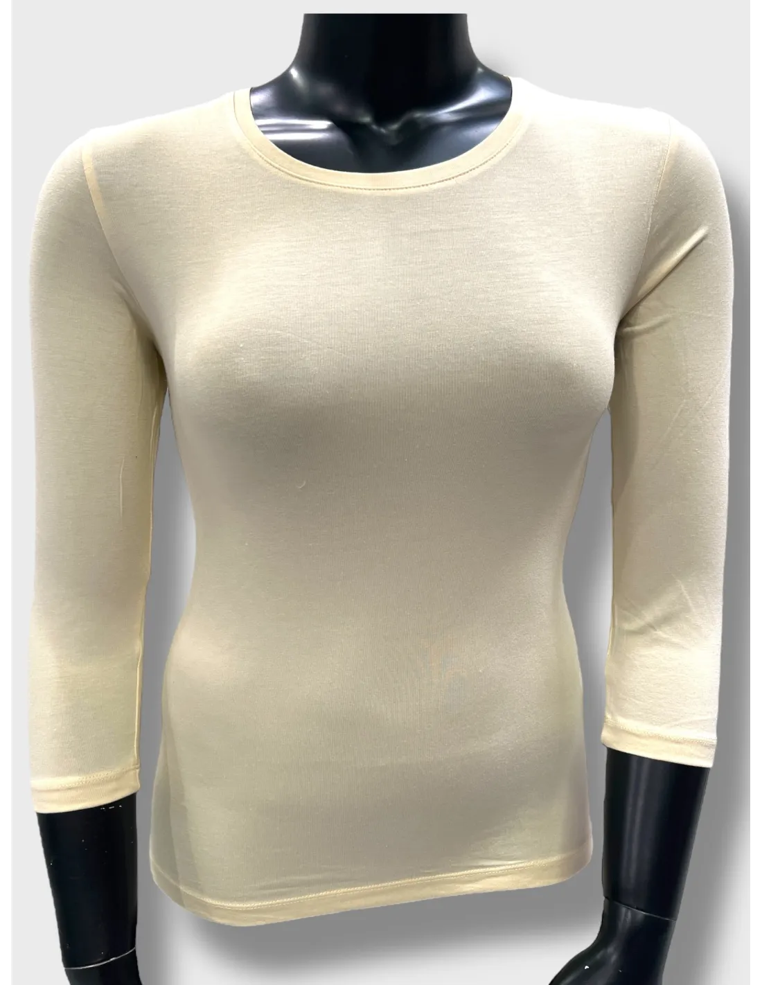 Med rund hals, glat finish og 3/4 ærmer er den et must i basisgarderoben.
