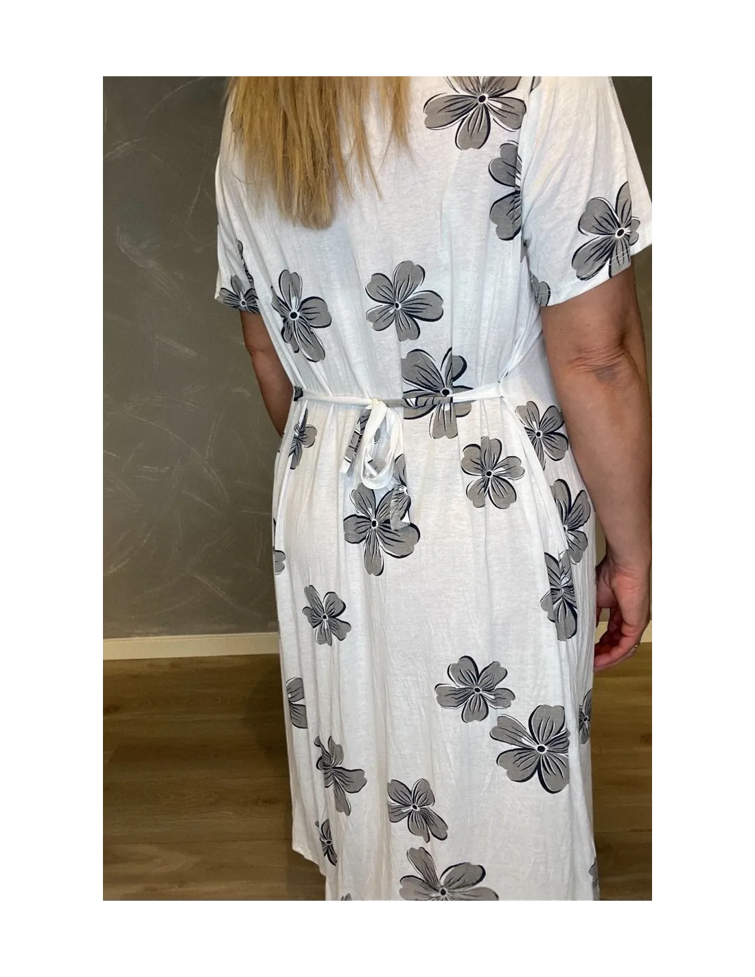 ALT TEKST: FRONT: "Hvid kjole med store grå blomster og bindebånd i taljen"