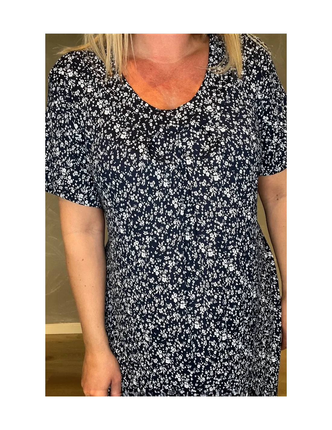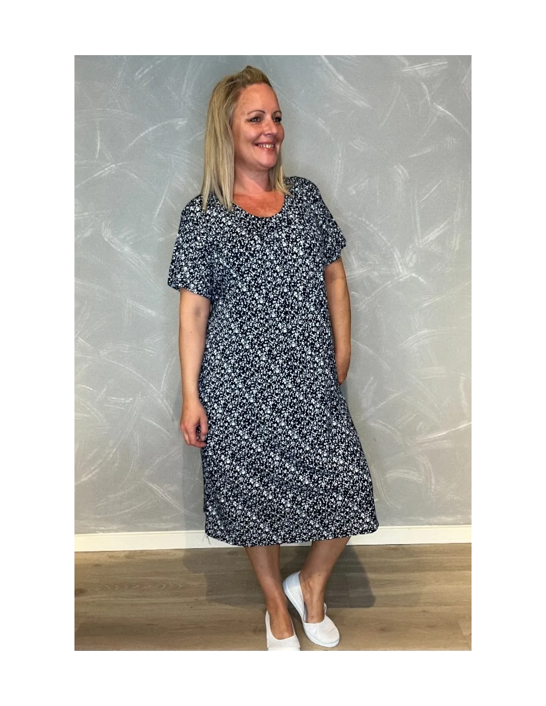 Komfortabel kjole med stort blomsterprint 95% viskose, 5% elastan Brystmål 128 cm, længde 110 cm Find din perfekte størrelse i vores størrelsesguide