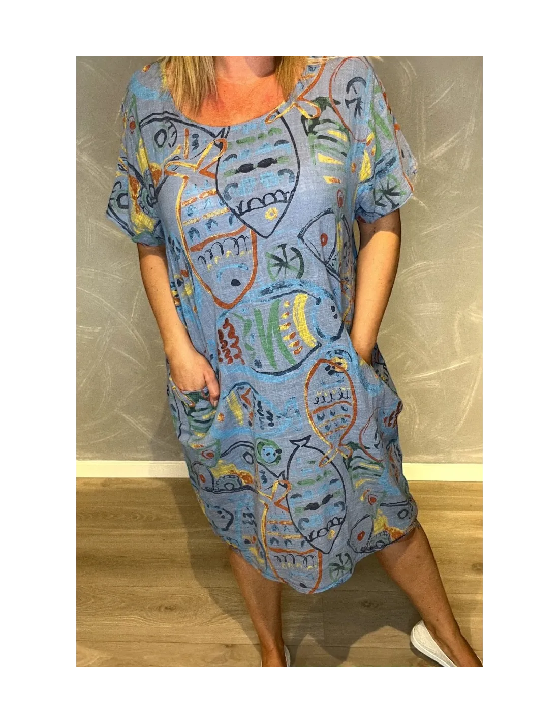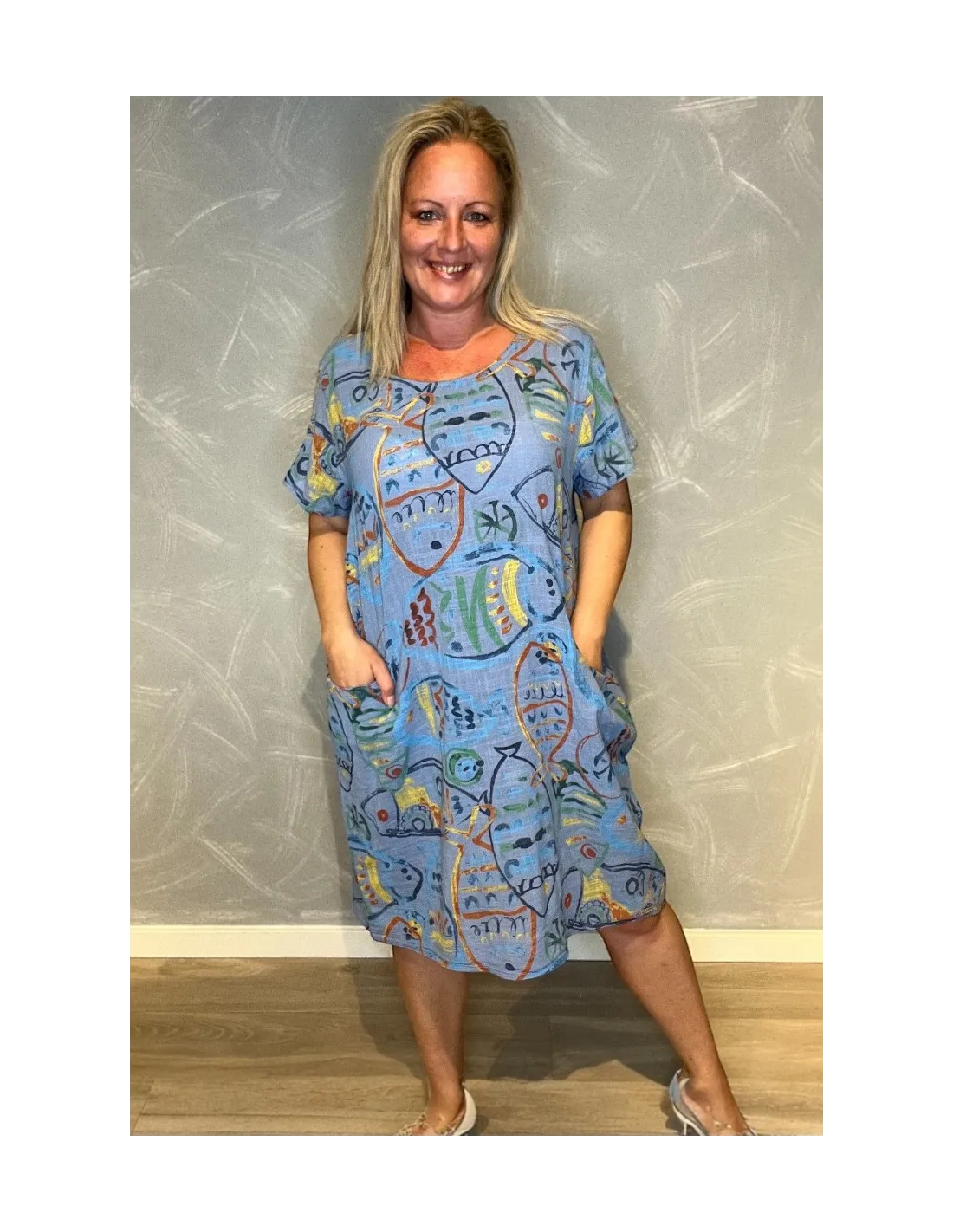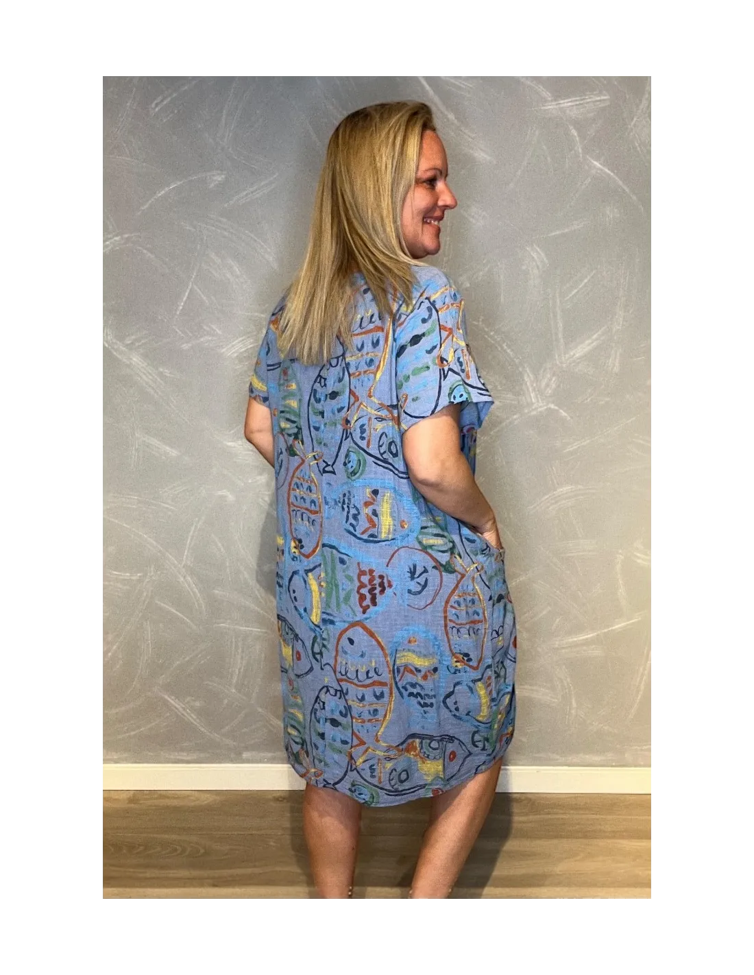 Blå kjole med fisk print og lommer til kvinder – TIPPY collection”
