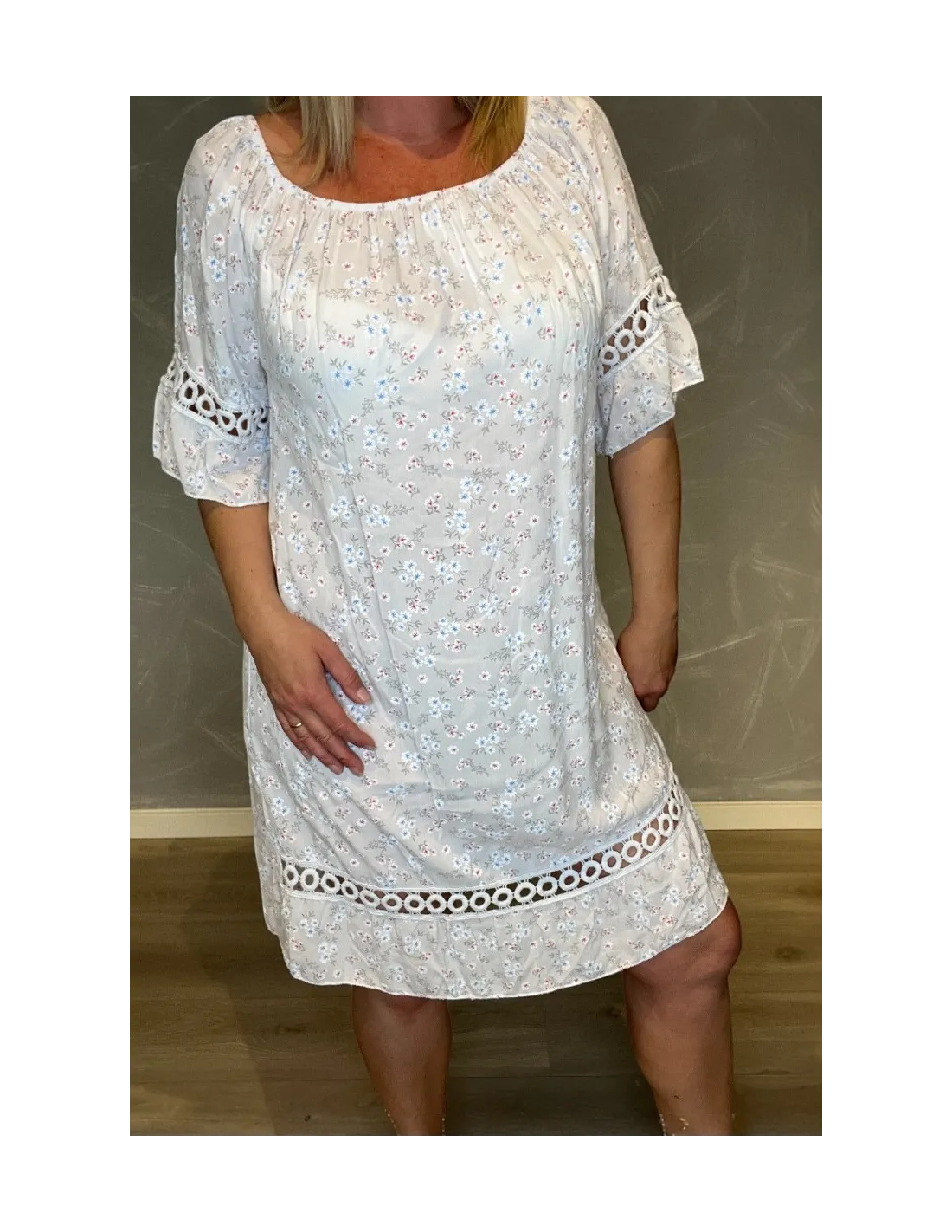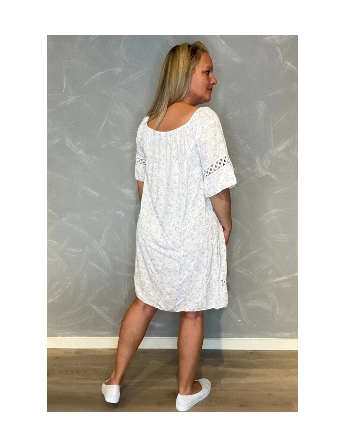 OM PRODUKTET: ✓ 95% viskose, 5% elastan ✓ Blomsterprint i hvid med blå detaljer ✓ Rund hals ✓ Korte ærmer med blonde kanter ✓ Brystmål 108 cm, længde 98 cm ✓ Afslappet pasform ✓ TIPPY kollektion