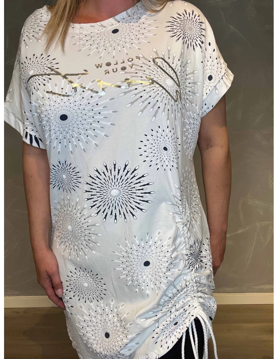 Denne feminine kjole med t-shirt ærmer, kombinerer et smukt abstrakt print med inspirerende sølvtekst, "Follow your heart.".  Den rene bomuldskvalitet sikrer optimal komfort og åndbarhed, så kjolen er komfortabel hele dagen. En skøn hverdag kjole hele sommeren igennem, med både lange, 3/4 eller korte leggings.