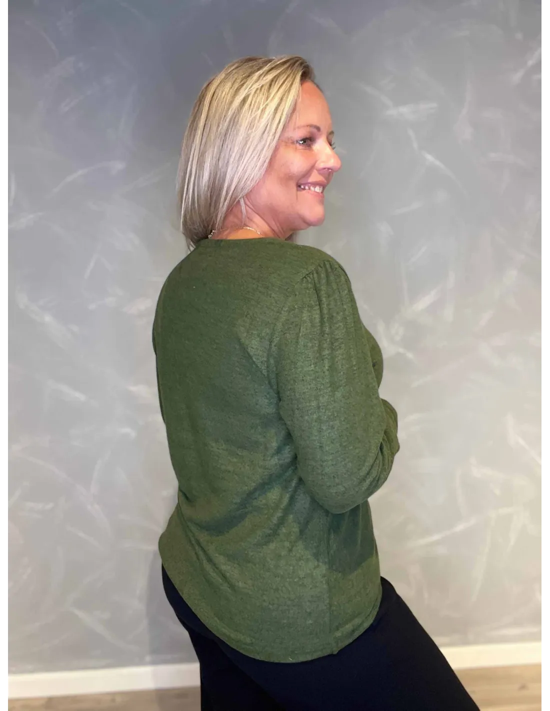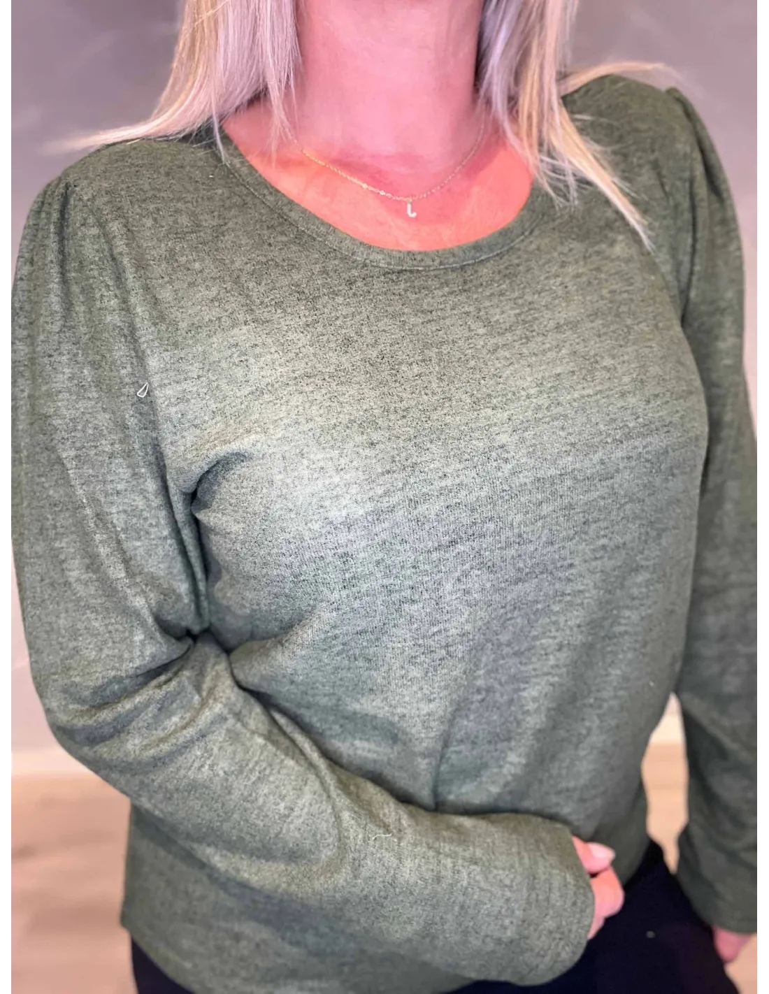 "Nærbillede af pufærmer på meleret grøn pullover bluse til kvinder - TIPPY"