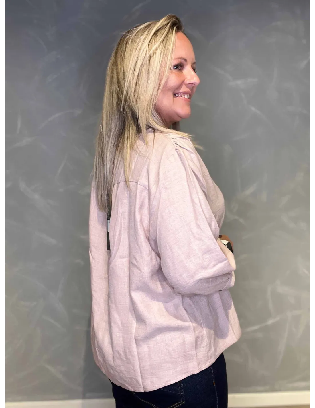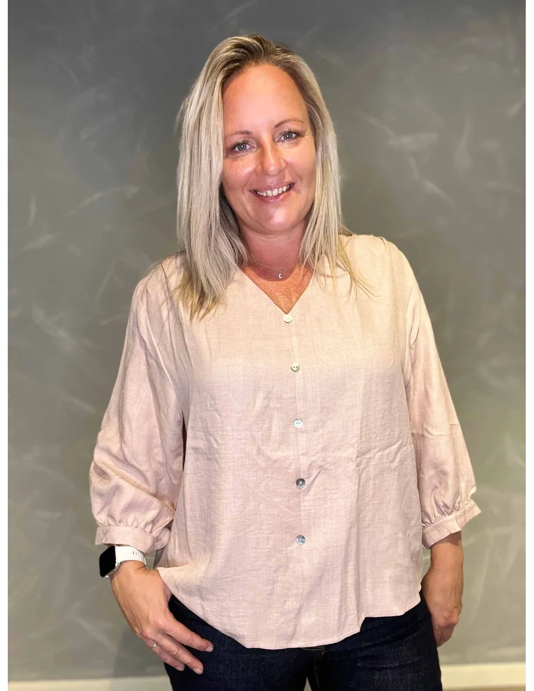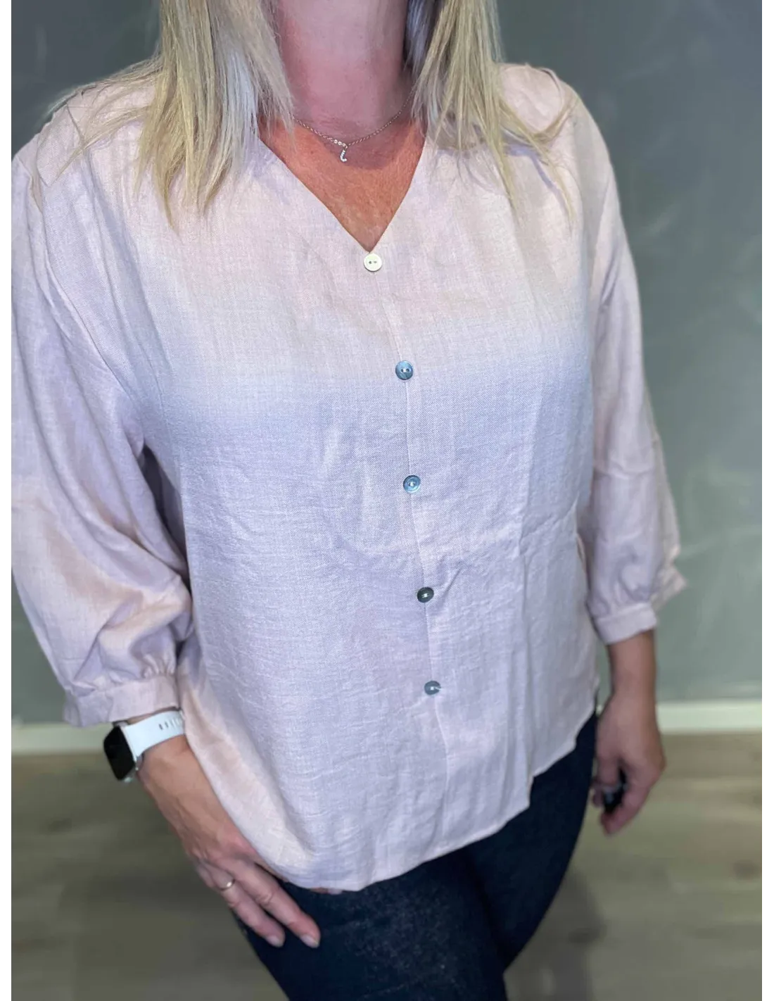 Skjorte med kinakrave og pynteknapper i hvid