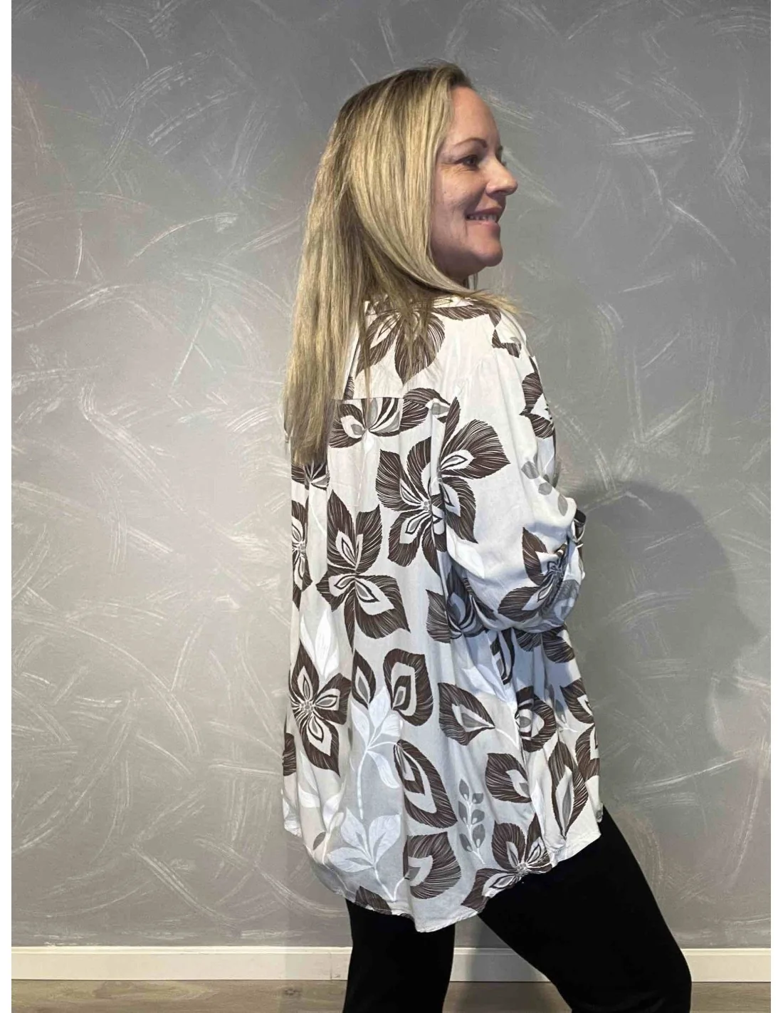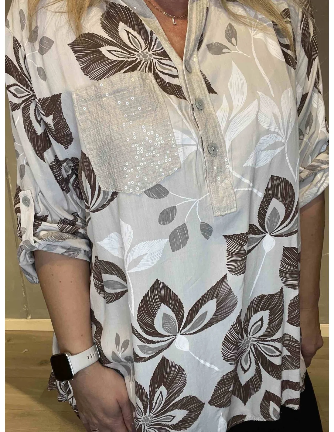 Denne blomstrede skjortebluse til kvinder fra Tippy Collection er fremstillet i let viskose.