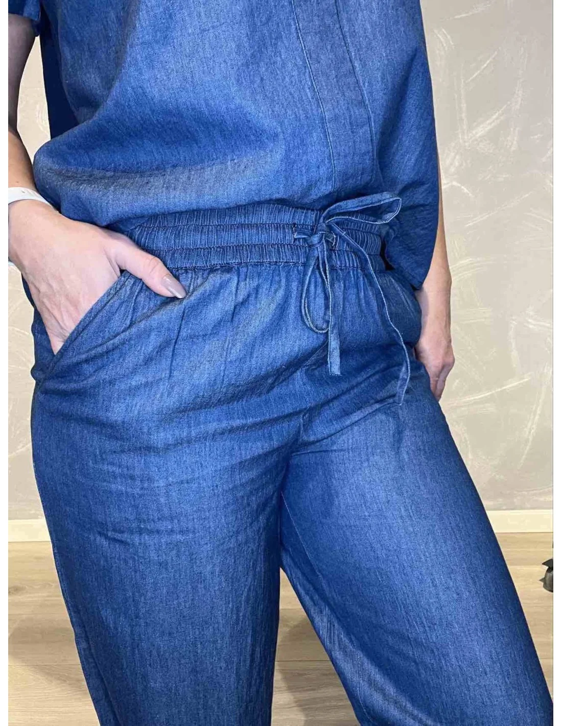 Den denim farve giver et feminint og afslappet udtryk.