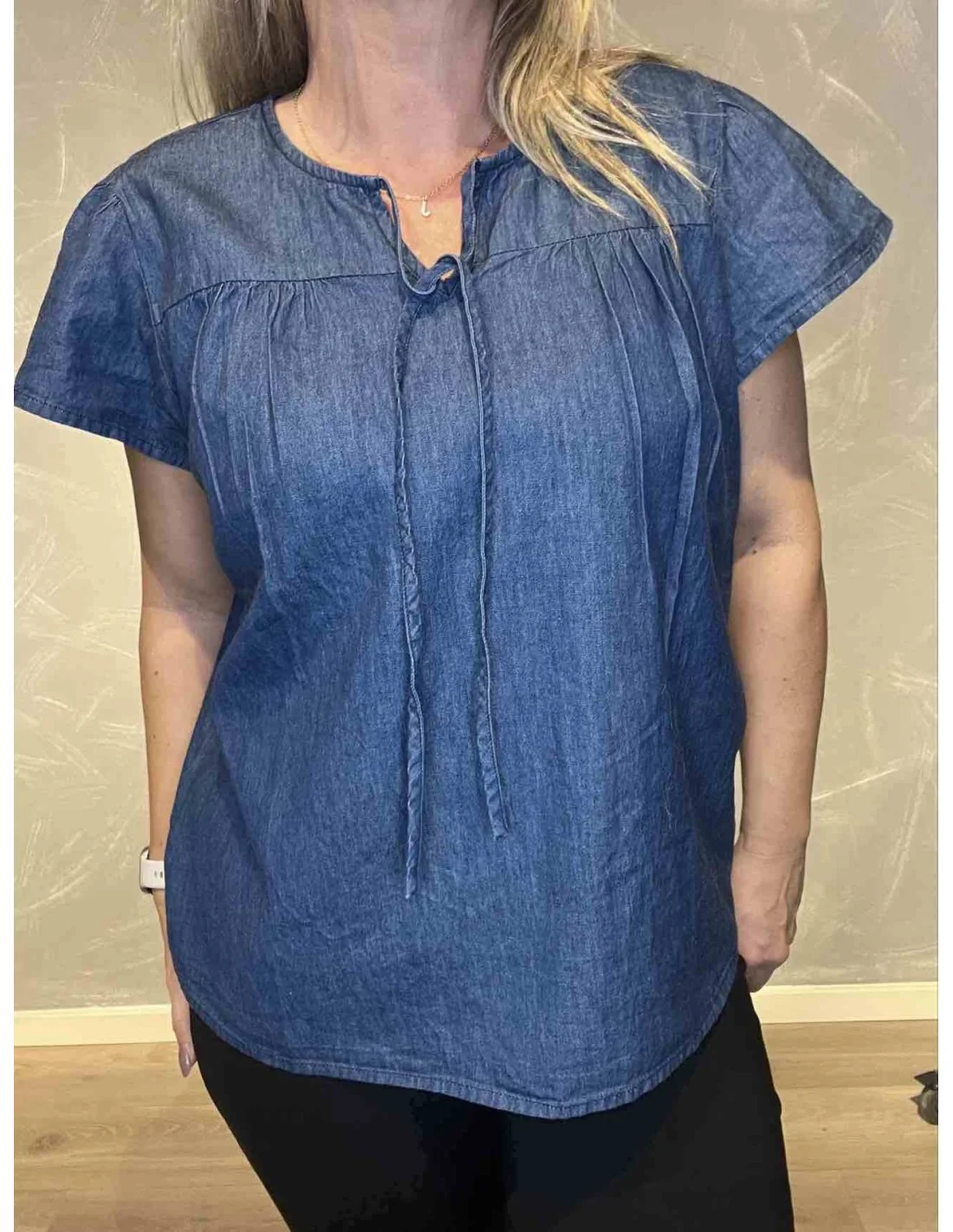 Den denim farve giver et feminint og afslappet udtryk.