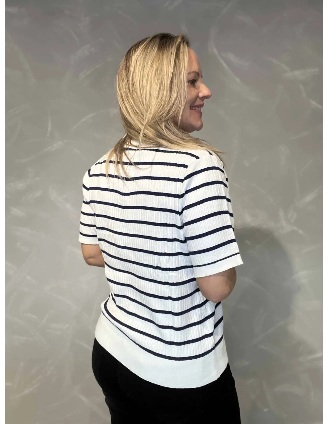 Farvekombinationen i navy og hvid giver et klassisk og maritimt udtryk.