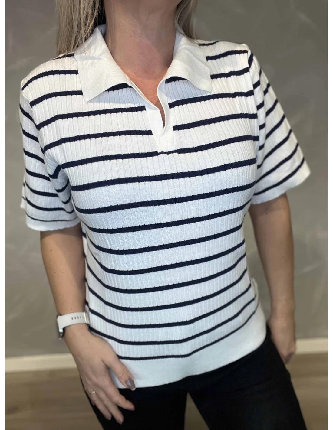 Denne rib strik med krave til kvinder fra TIPPY Design er fremstillet i en blød viskoseblanding.