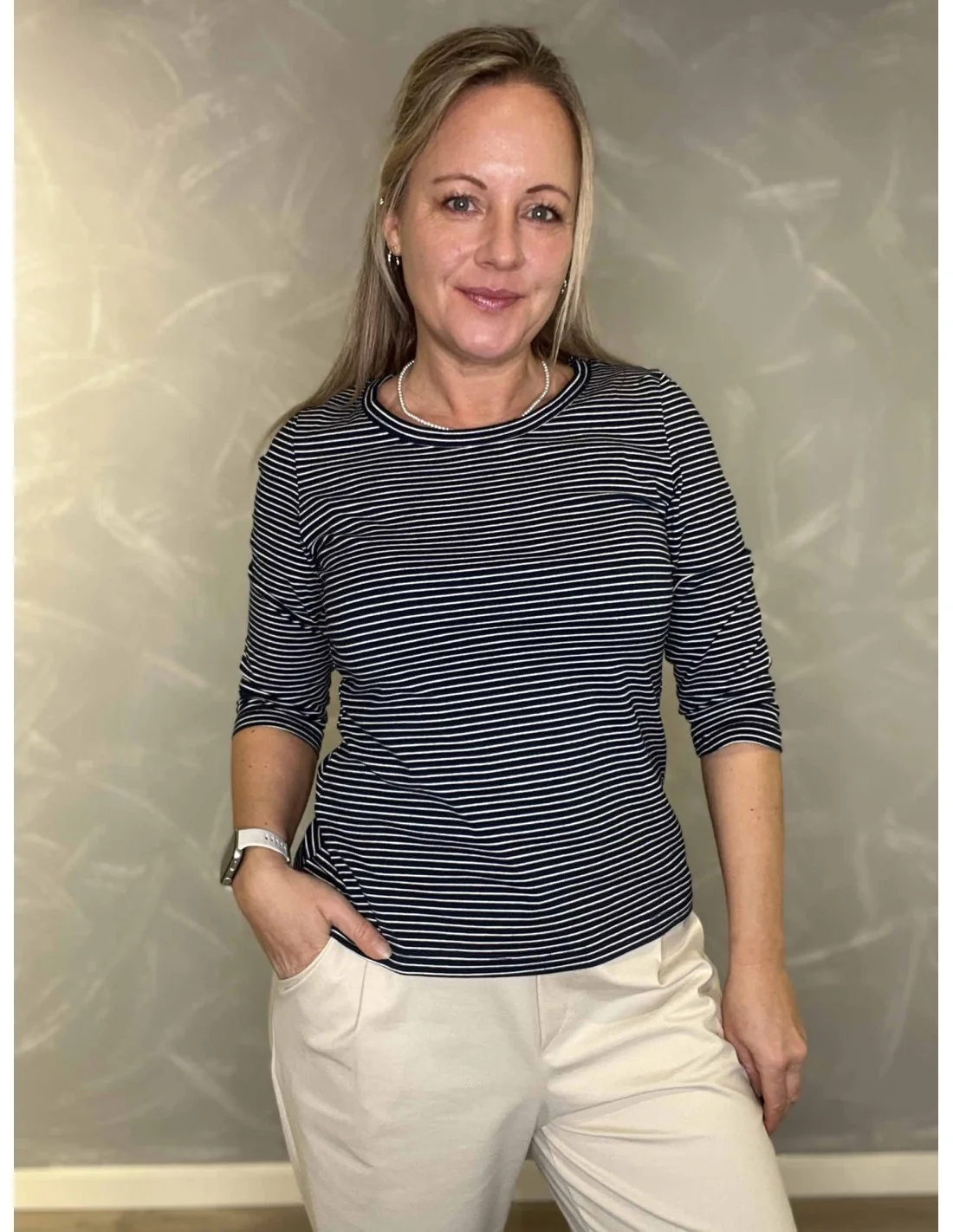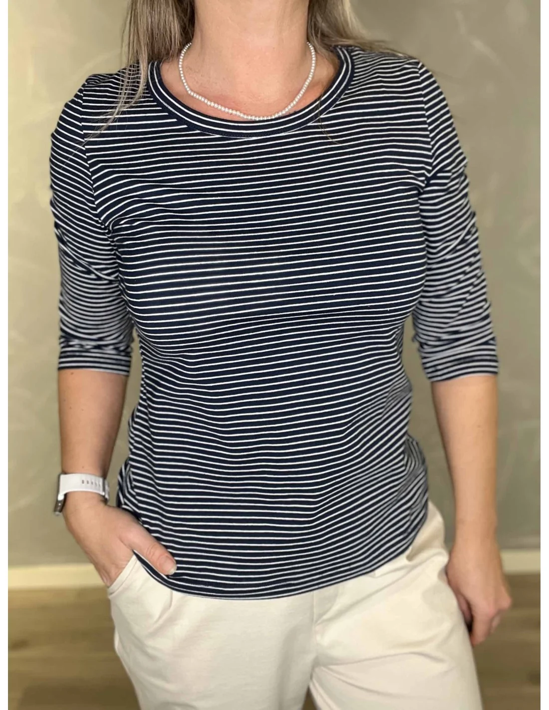 Navy/milk 3/4 ærmet stribet t-shirt til kvinder – Design by TIPPY