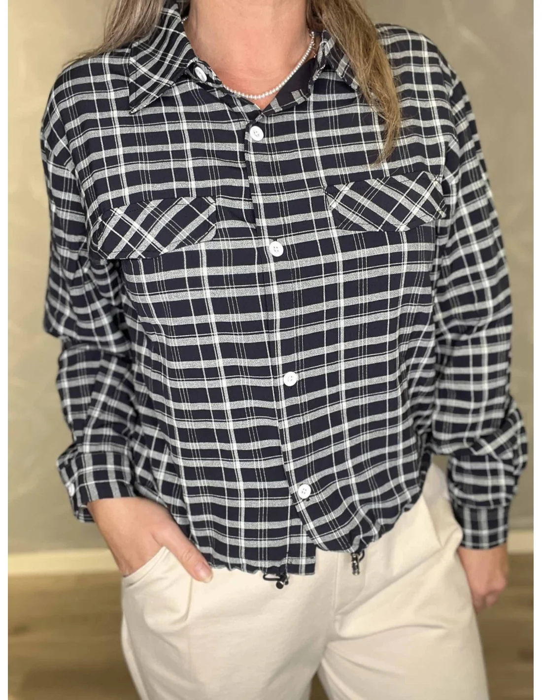 Den jeans blå farve med store tern giver et klassisk og afslappet udtryk.