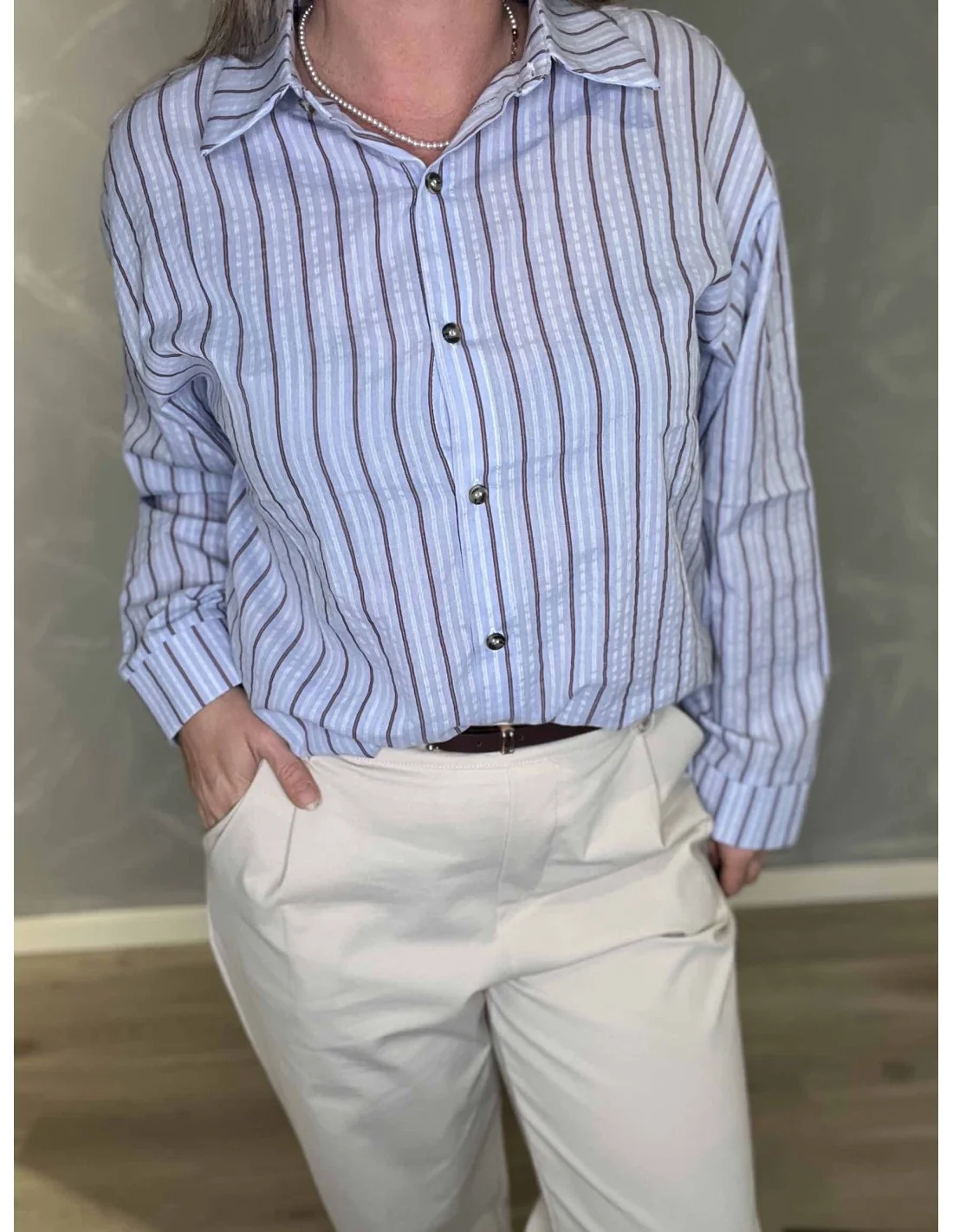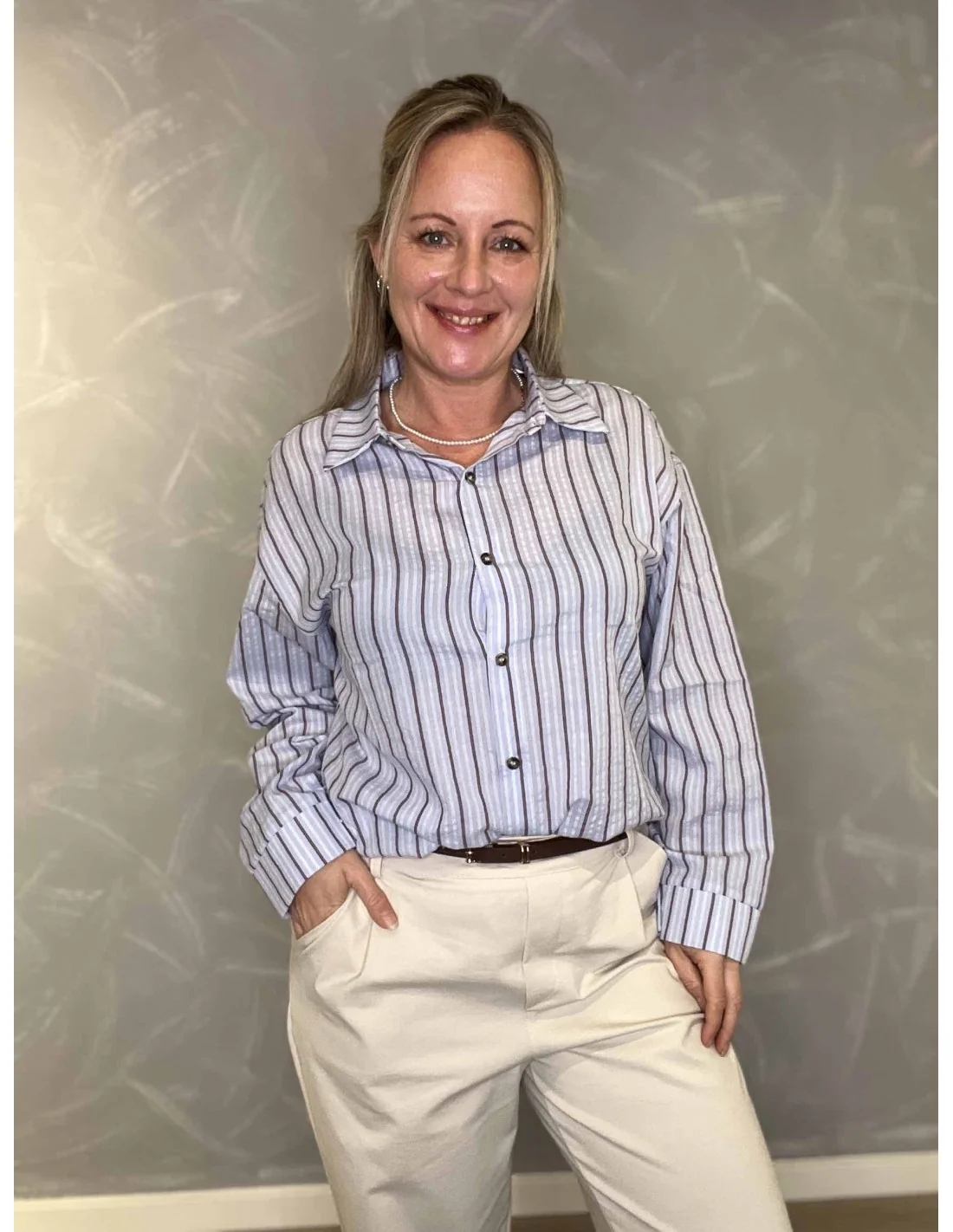 Den blå farve med fine striber giver et klassisk og let udtryk.