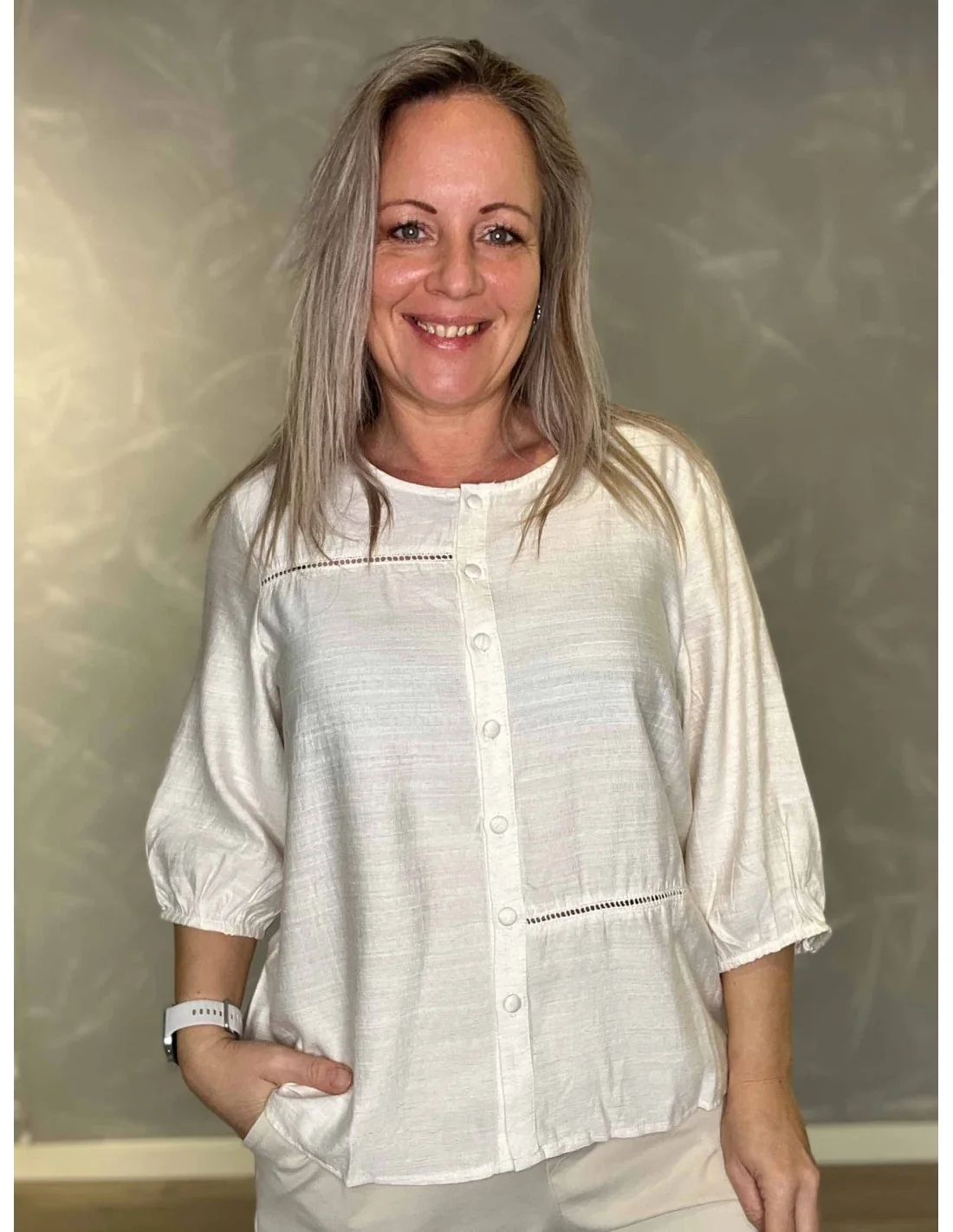 Denne skjorte til kvinder fra Design by TIPPY er fremstillet i 80% bomuld, 10% nylon og 10% hør.