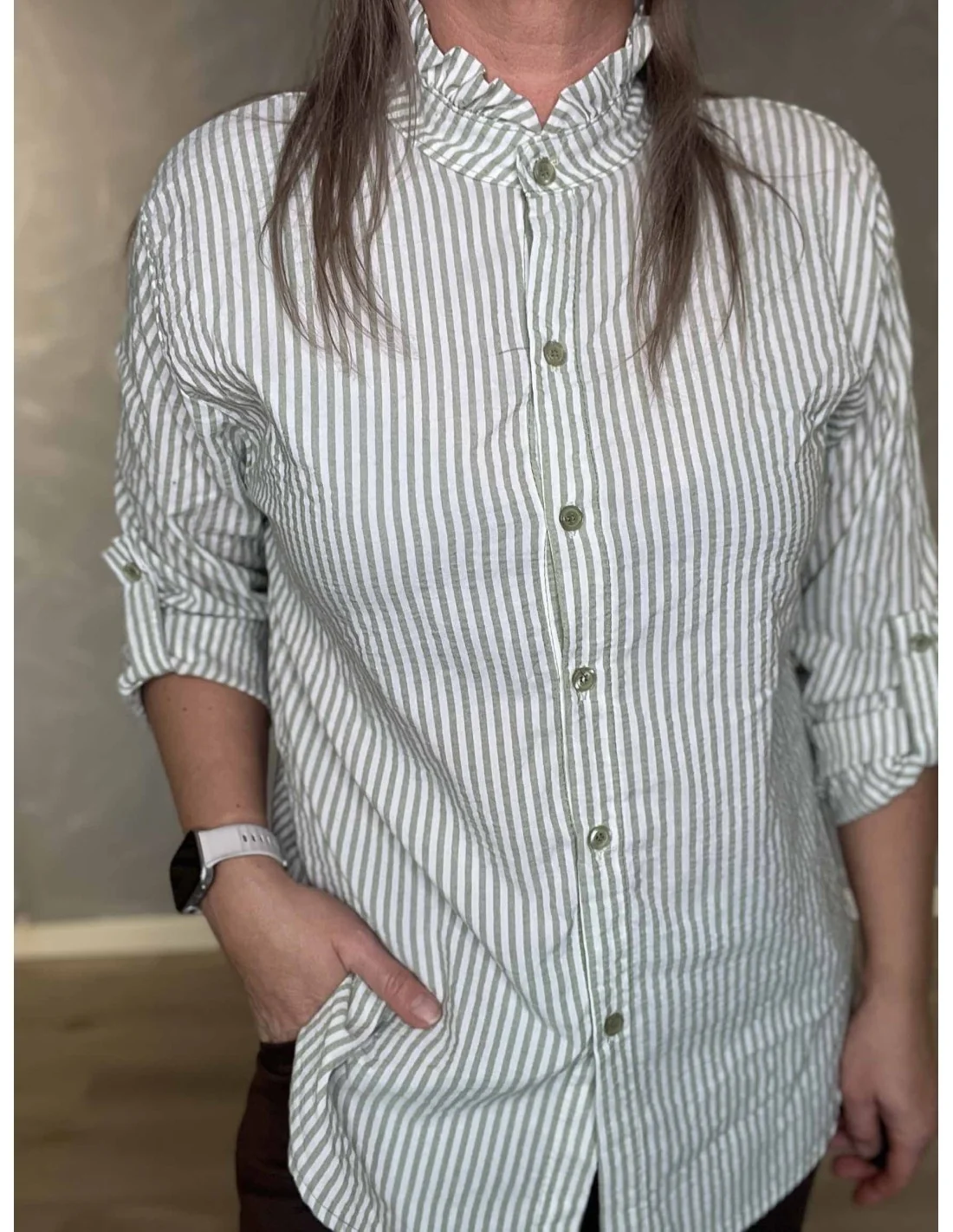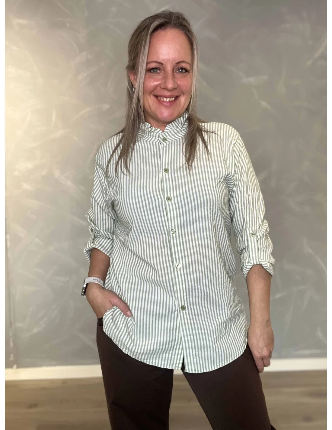 Den sandfarvede strib giver et klassisk og feminint udtryk.