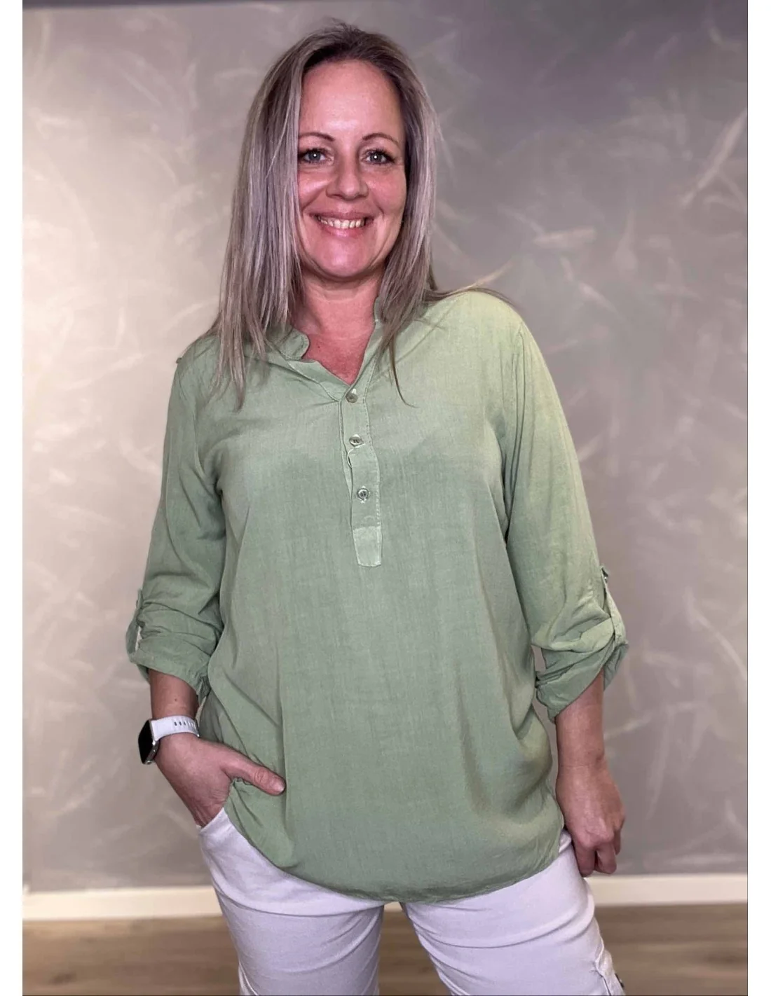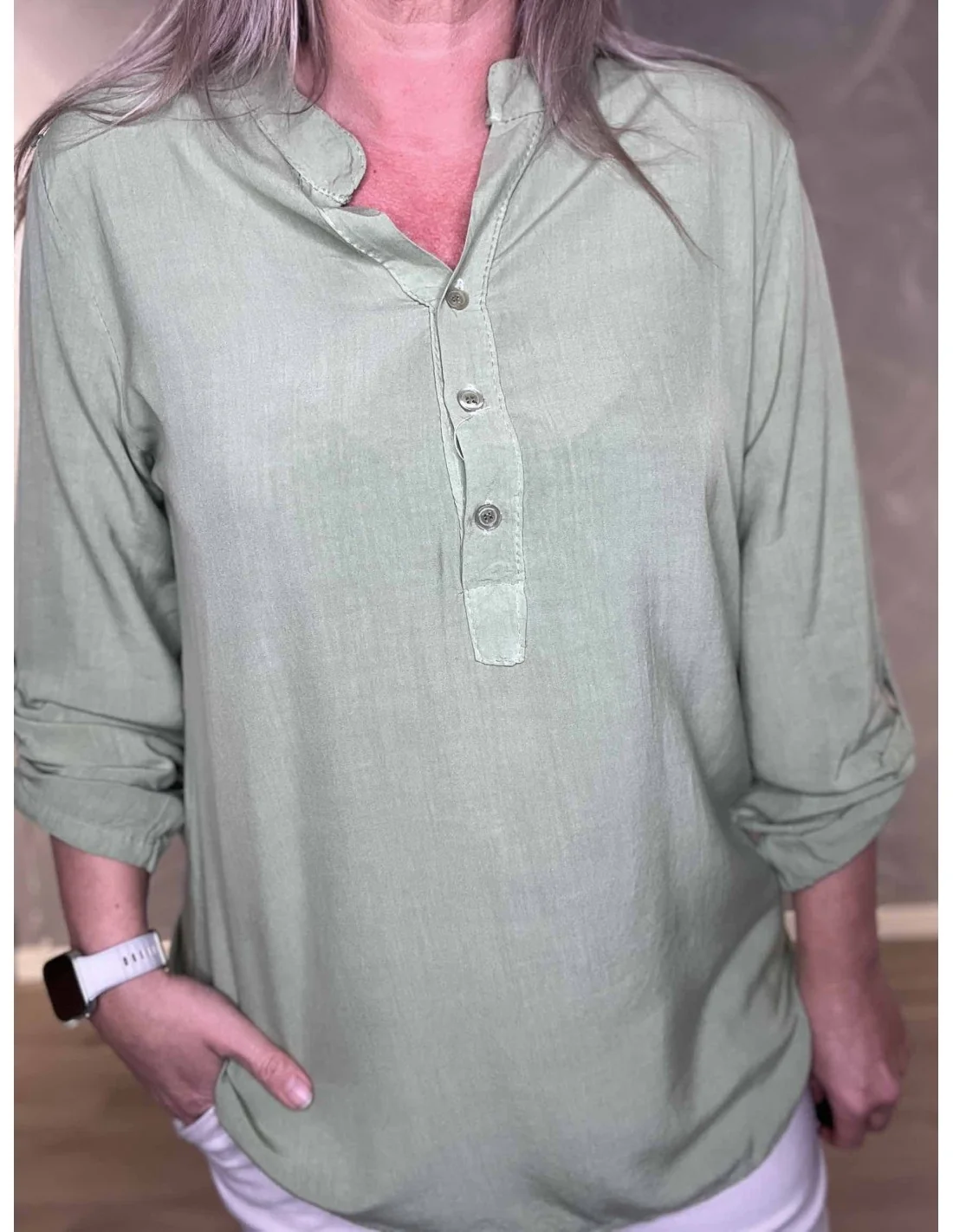 Knaplukning på grøn skjorte bluse – TIPPY