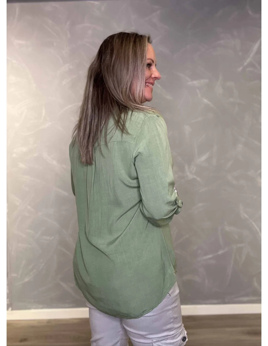 Bagside af grøn skjorte bluse med længere baglængde – TIPPY