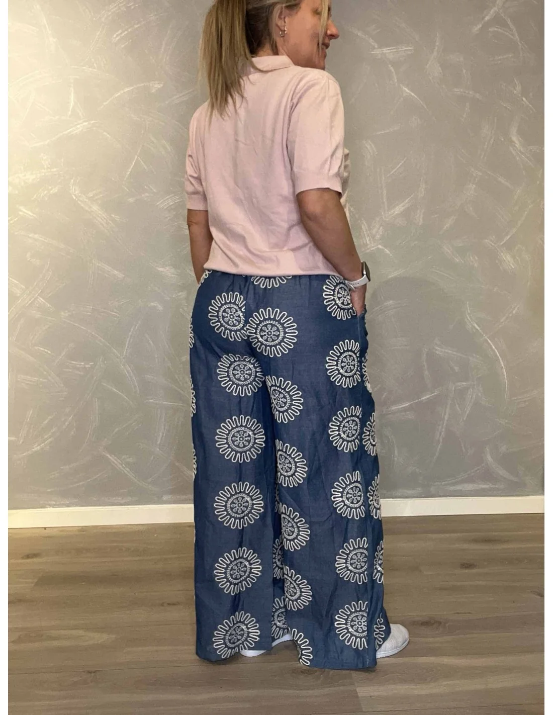 Denne viddede denim bukser til kvinder fra TIPPY Collection er fremstillet i 60% bomuld 40% polyester.
