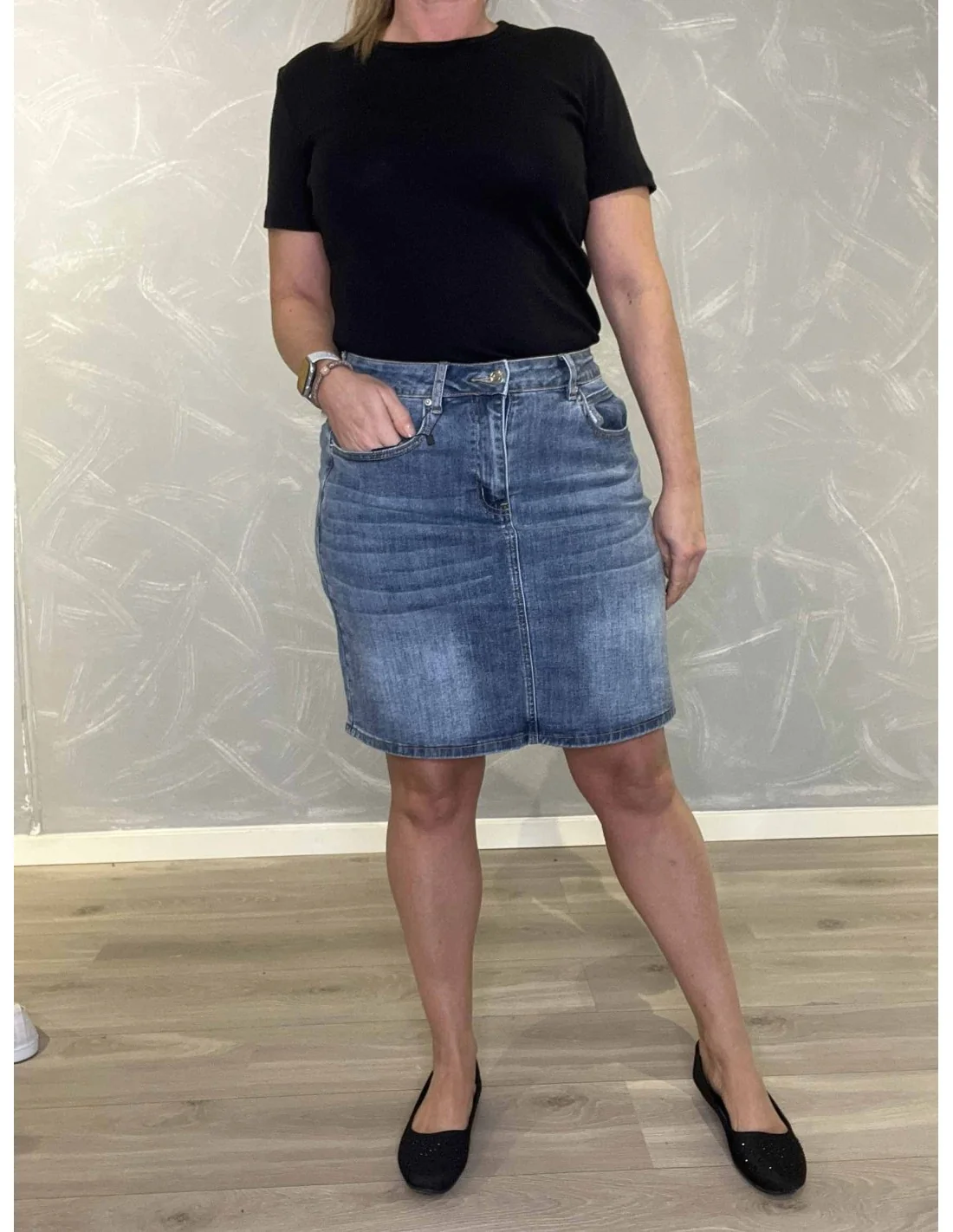 Denne kort denim nederdel til kvinder fra Design by TIPPY er fremstillet i 80% bomuld 18% polyester 2% elastan.