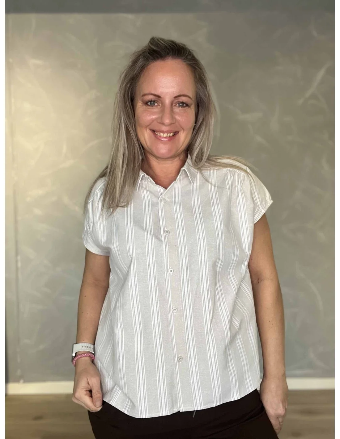 Den beige farve med striber giver et feminint og tidløst udtryk.