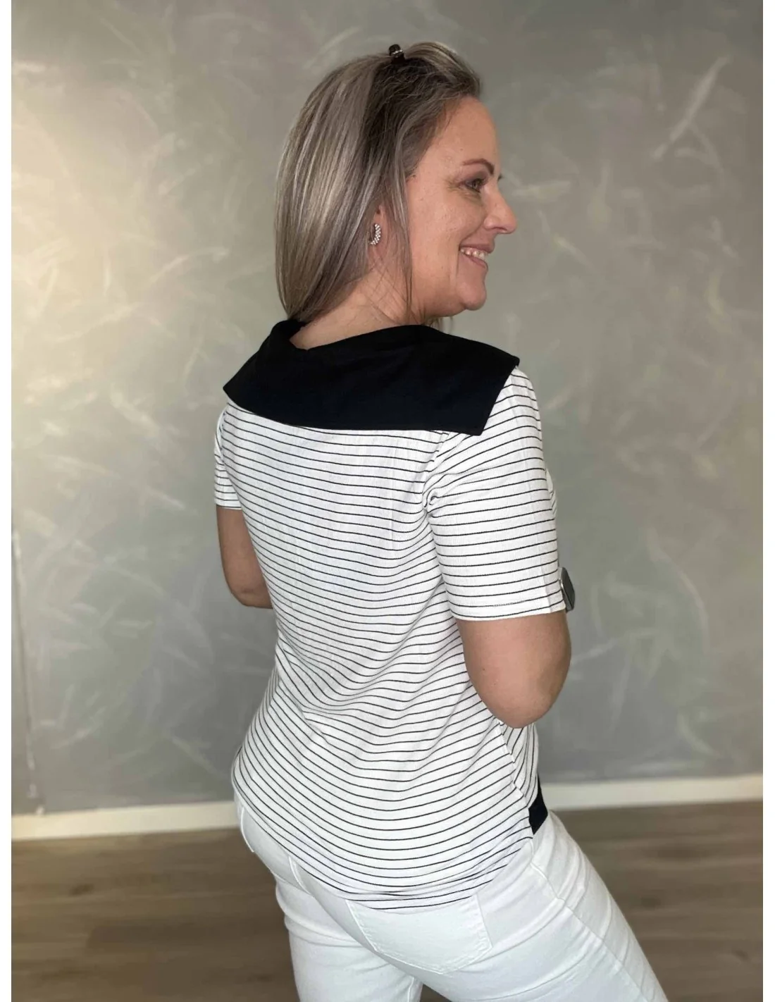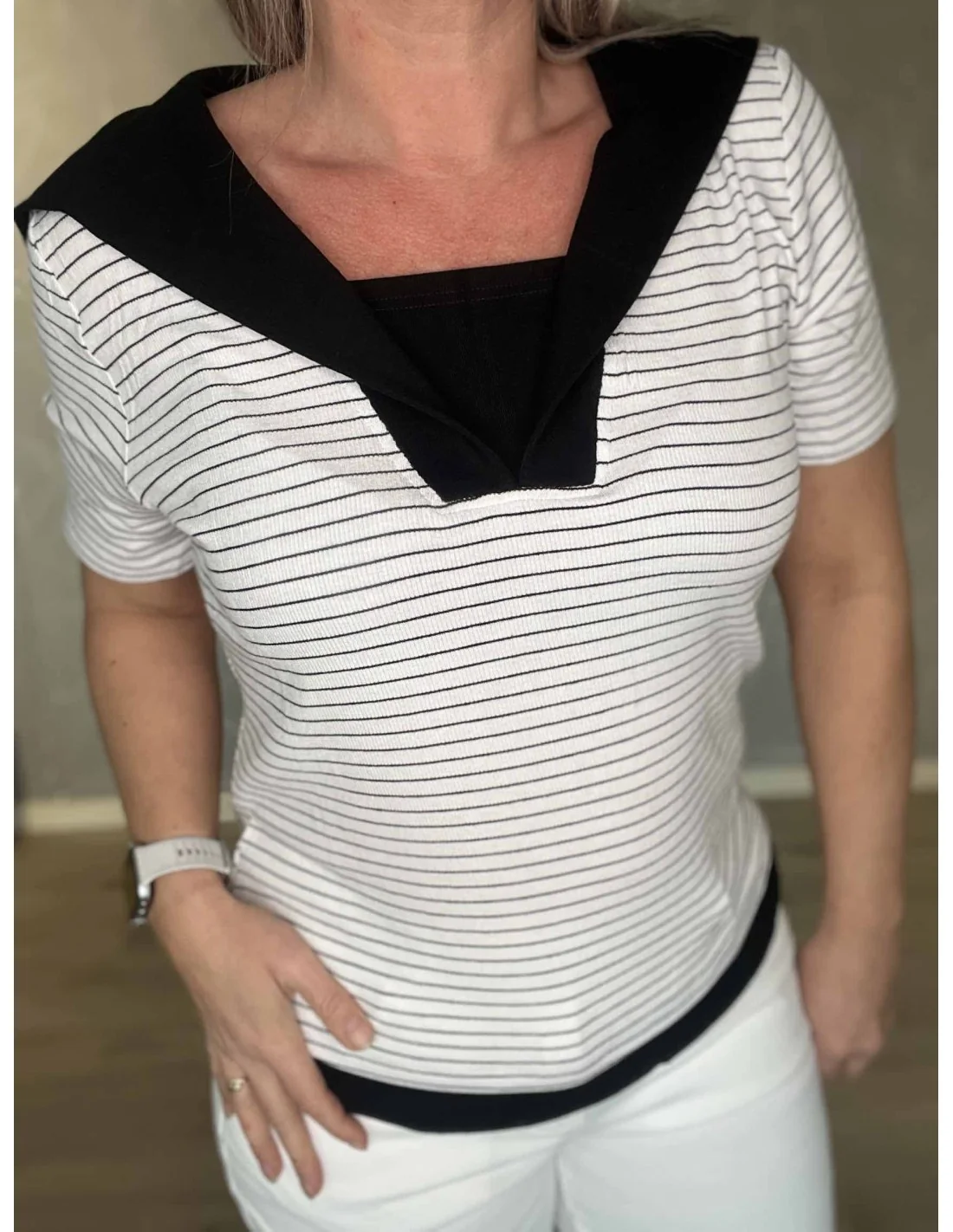 Bagside af hvid stribet bluse med matroskrave – TIPPY