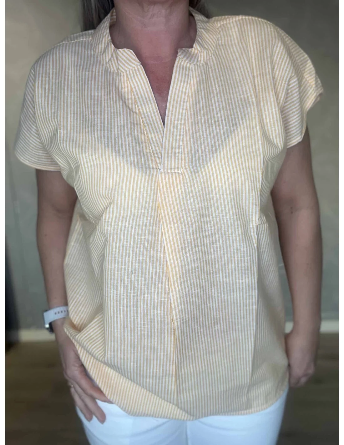 Gul t-shirt med små striber og V-hals til kvinder – Design by TIPPY