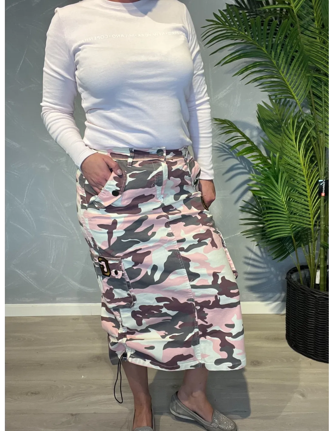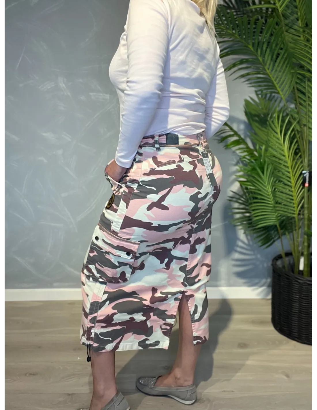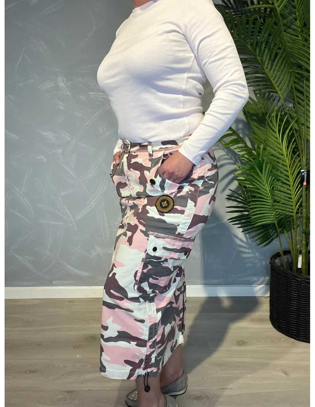 Rosa camouflage cargo nederdel med praktiske lommer og påsyede lapper